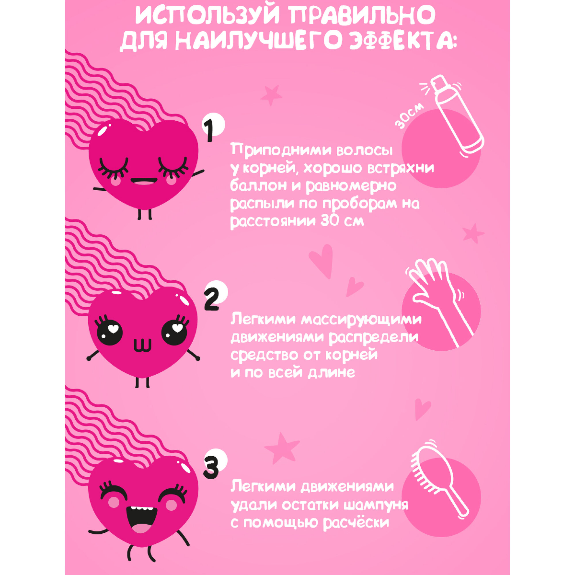 | Способ применения | Тщательно встряхни баллон и распыли средство на сухие волосы с расстояния 20-30 см, уделяя особое внимание корням. Подожди 30-60 сек., затем массирующими движениями распредели средство по волосам. Тщательно расчеши волосы расческой. |