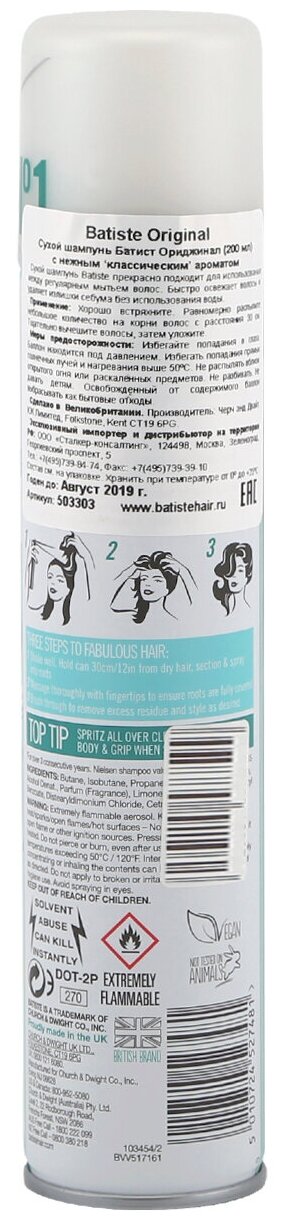 | Способ применения | распылите сухой шампунь на волосы на расстоянии 30 см. Помассируйте голову несколько минут. Во время массажных движений пальцами сухой шампунь проникает в стержень волоса, абсорбирует грязь и жир, тем самым восстанавливая его. Причешитесь и ваши волосы снова мягкие и чистые |