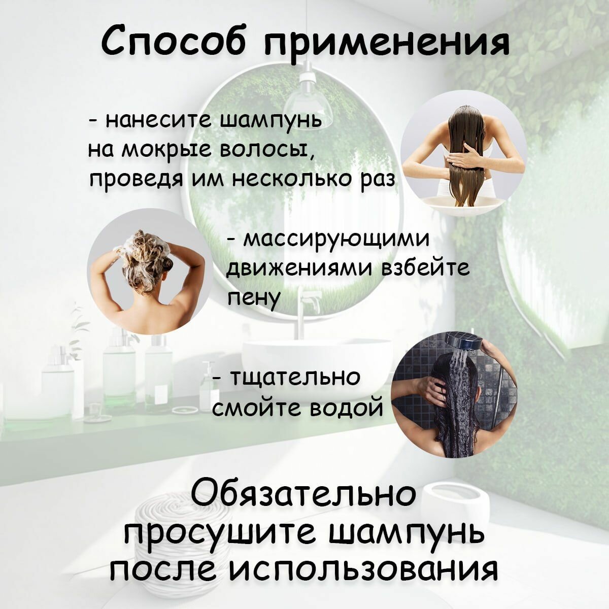 | Способ применения | Способ применения - нанесите шампунь на мокрые волосы, проведя им несколько раз - массирующими движениями взбейте пену - тщательно смойте водой Обязательно просушите шампунь после использования |