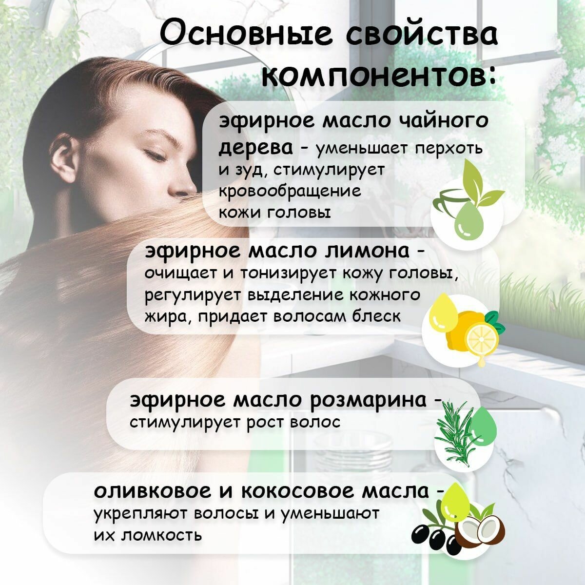 | Эффект | активация роста / восстановление / глубокая очистка / защита от негативного воздействия окружающей среды / очищение / питание / придание блеска / придание мягкости / против выпадения / против перхоти / против секущихся кончиков / разглаживание / снятие зуда и раздражения / увлажнение / укрепление / успокаивающий |