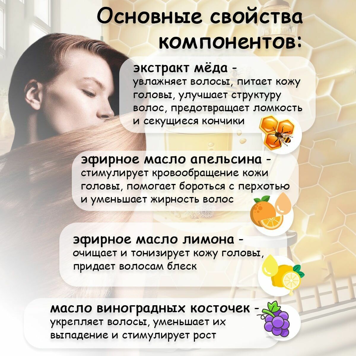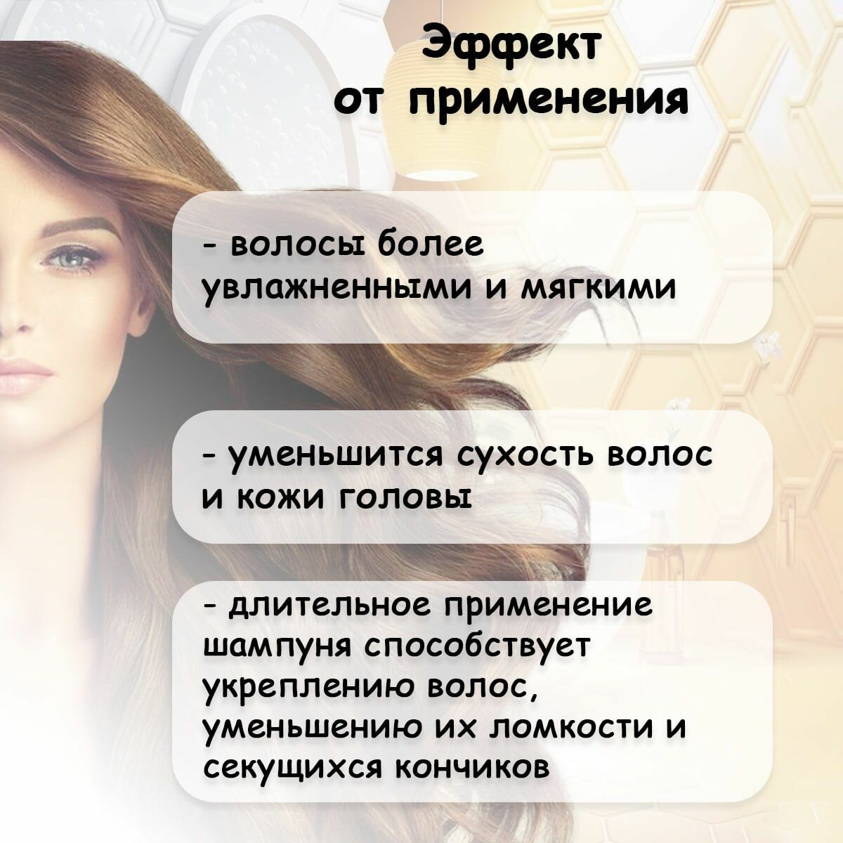 | Эффект | активация роста / восстановление / глубокая очистка / защита от негативного воздействия окружающей среды / очищение / питание / придание блеска / придание мягкости / против выпадения / против перхоти / против секущихся кончиков / разглаживание / снятие зуда и раздражения / увлажнение / укрепление / успокаивающий |