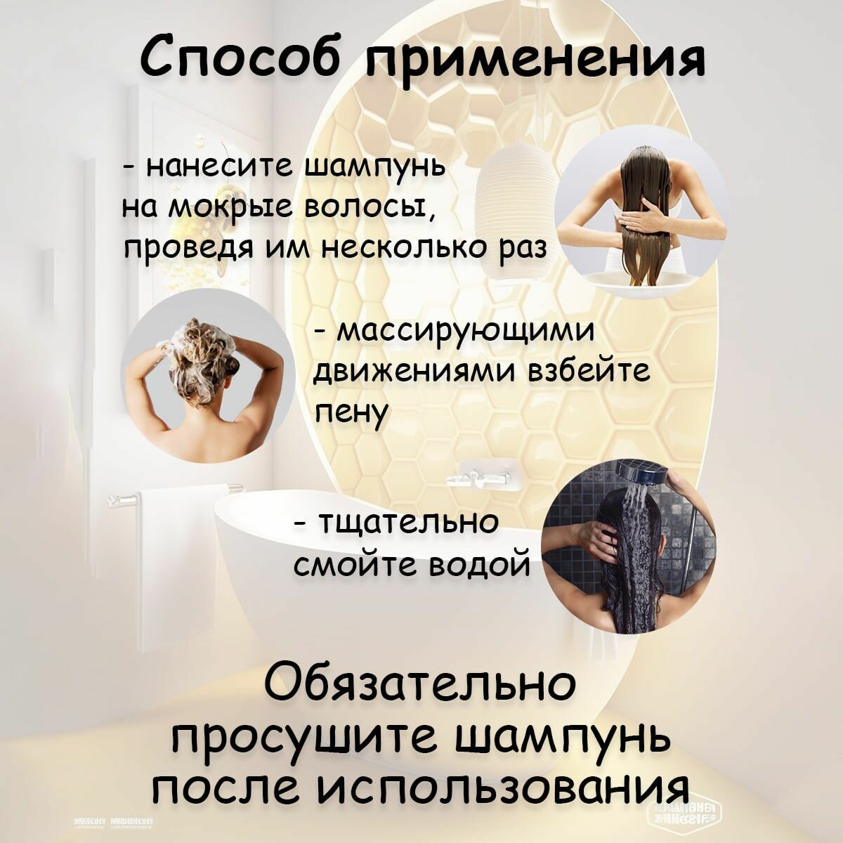 | Способ применения | Способ применения - нанесите шампунь на мокрые волосы, проведя им несколько раз - массирующими движениями взбейте пену - тщательно смойте водой Обязательно просушите шампунь после использования |
