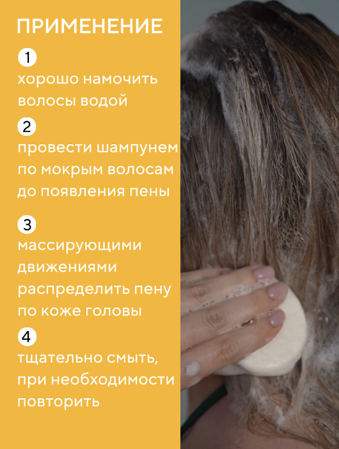 | Способ применения | Хорошо намочить волосы водой. Провести шампунем по мокрым волосам (корни волос) до появления пены. Либо вспенить шампунь в руках, получившуюся пену распределить по мокрым волосам (корням волос). Массирующими движениями распределить пену по коже головы. Тщательно смыть. При необходимости повторить. |