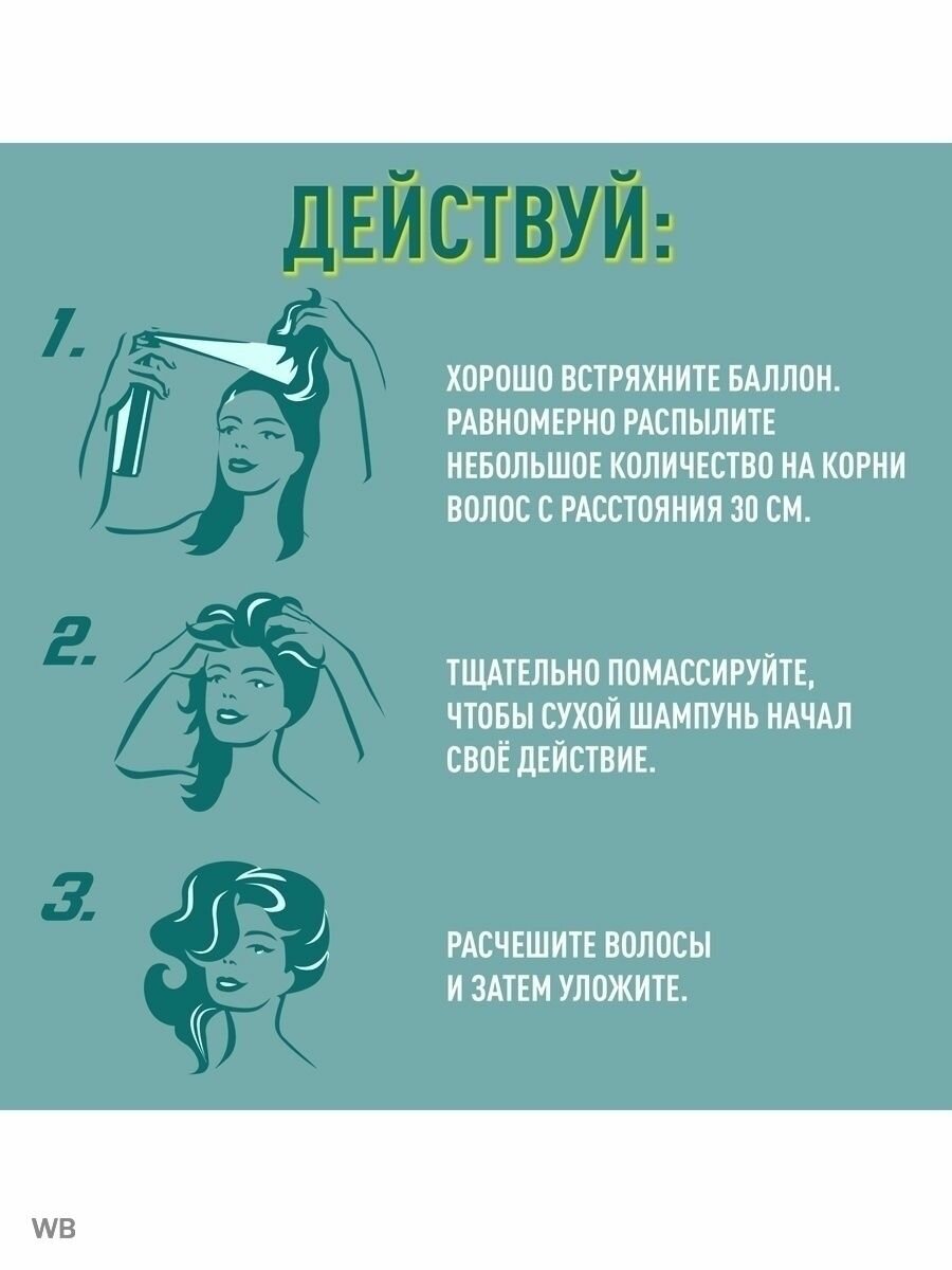 | Способ применения | распылите сухой шампунь на волосы на расстоянии 30 см. Помассируйте голову несколько минут. Во время массажных движений пальцами сухой шампунь проникает в стержень волоса, абсорбирует грязь и жир, тем самым восстанавливая его. Причешитесь - ваши волосы снова мягкие и чистые |
