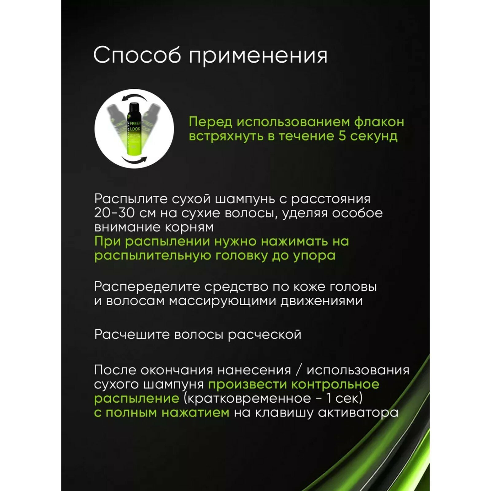 | Способ применения | Перед применением хорошо встряхните баллон. Распылите шампунь к корням волос с расстояния приблизительно 30 см и вмассируйте в волосы. После этого вычешите волосы расческой и уложите стандартным способом. |