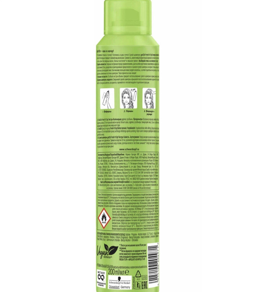| Способ применения | интенсивно встряхнуть перед применением, распылить короткими нажатиями на сухие волосы с расстояния 20 см, закрыть шампунь крышкой после использования |