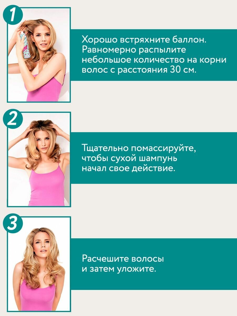 | Способ применения | Распылите сухой шампунь на волосы на расстоянии 30 см. Помассируйте голову несколько минут. |