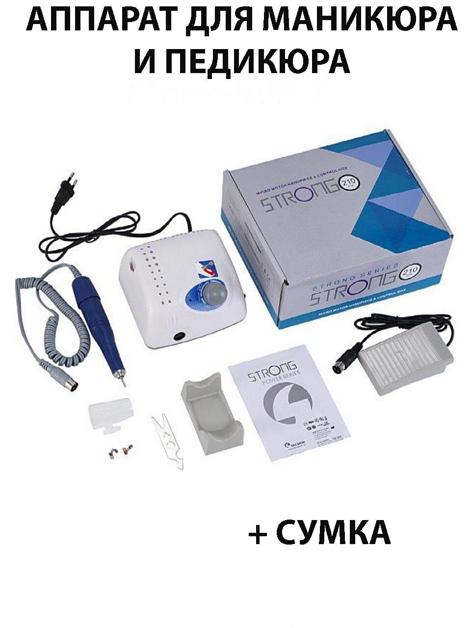 Аппарат для маникюра и педикюра Strong 210/105L, Strong с педалью и сумкой, 35000 оборотов в минуту интересное: