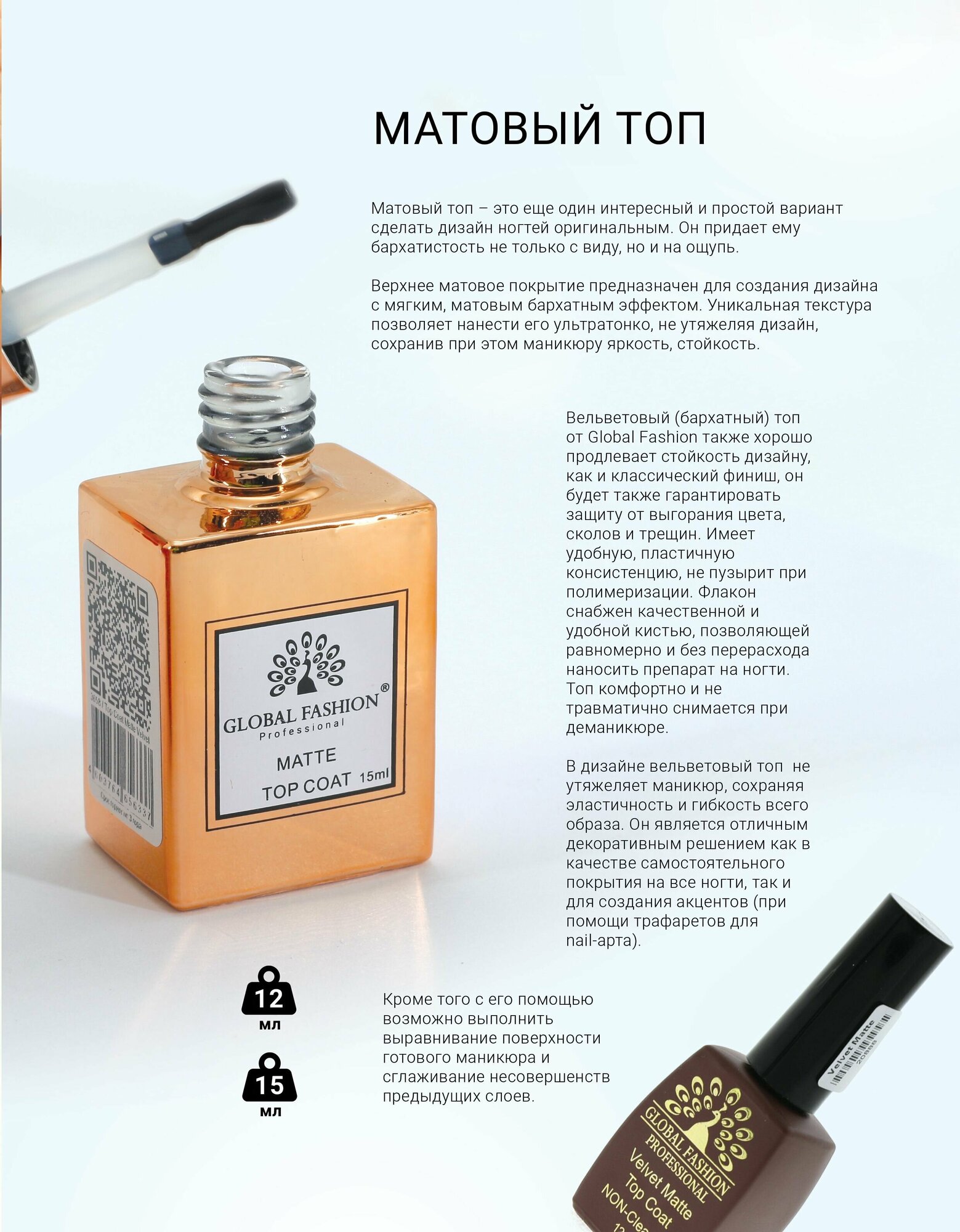 Global Fashion Матовый топ без липкого слоя для гель-лака, с бархатным эффектом Velvet Matte, 15 мл интересное: