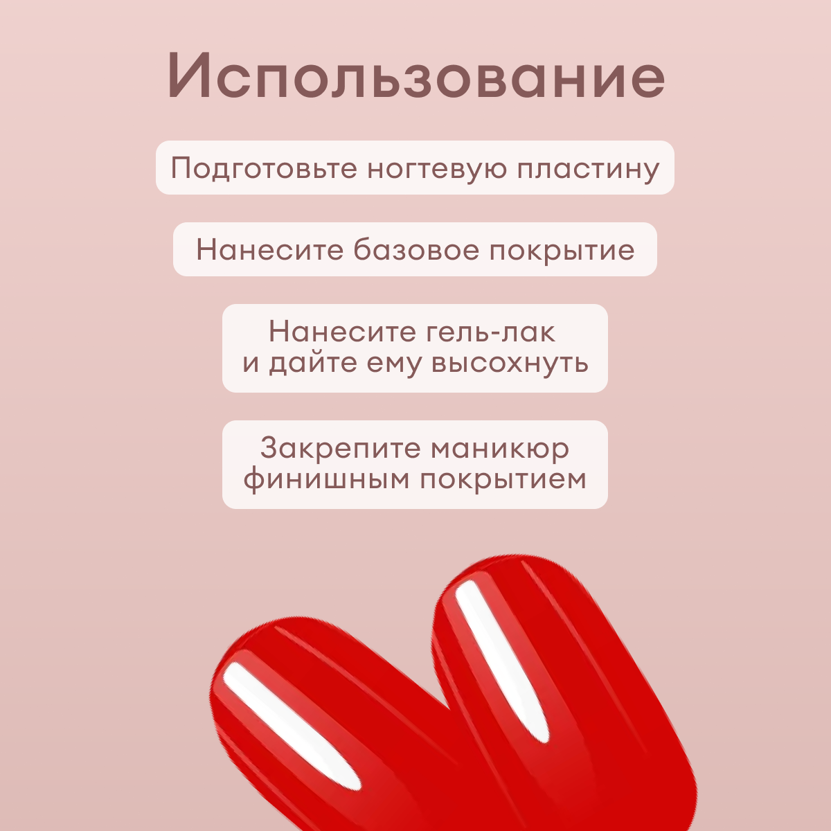 | Способ применения | подготовка ногтевой пластины (НП): 1. Снять природный глянец с натурального ногтя при помощи бафа или пилки для натуральных ногтей. 2. Выполнить гигиенический маникюр любым привычным способом (аппаратный, обрезной, комбинированный). 3. Нанести на НП дегидратор, подсушить на воздухе 60 сек. 4. Полусухой кистью нанести праймер на НП, подсушить на воздухе 2-3 мин. Базовое покрытие: 1. Нанести первый тонкий слой базы втирающими движениями. 2. Просушить в UV/LED лампе - 60 сек. 3. Выполнить выравнивание или смоделировать архитектуру ногтя. 4. Просушить в UV/L ED лампе - от 60 сек. Нанесение цветного покрытия гель-лаком пошагово: 1. Нанести гель-лак runail GEL POLISH в 1-2 слоя. 2. Каждый слой просушить в UV/LED лампе - 60 сек. Финишное покрытие: 1. Закрепить маникюр финишным покрытием для гель-лака. 2. Просушить в UV/LED лампе - 60 сек. При соблюдении технологии нанесения стойкость маникюра составит до 4-х недель |