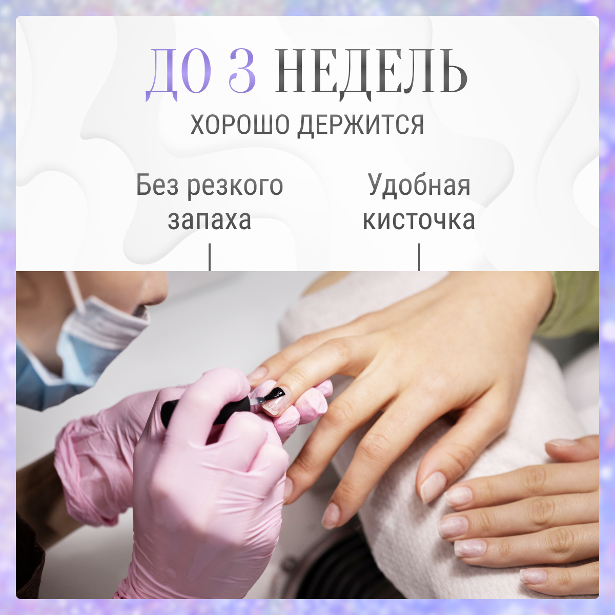 | Способ применения | Для начала следует подготовить ногти к процедуре: Обезжирьте ногтевую поверхность. Нанесите базовое покрытие. Просушите базовый слой с использованием лампы. После этого выполните следующие шаги: Покрасьте ногти выбранным цветом и дождитесь его высыхания. Нанесите финальное покрытие. Удалите дисперсионный слой с помощью специальной жидкости. |