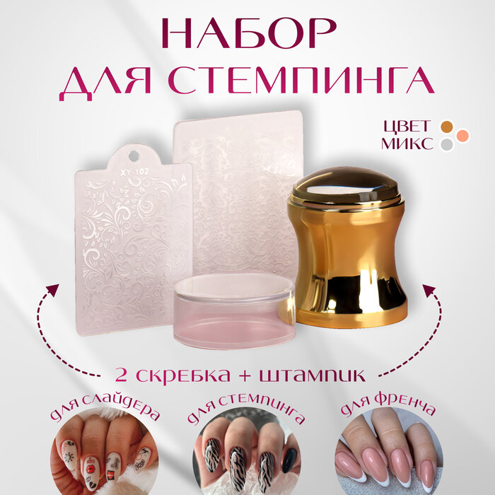 Набор для стемпинга 3пр: штампик с крышкой, 2 скребка-подложки микс пакет QF 5070598