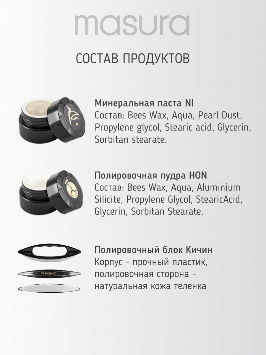 | Дополнительная информация | Процедура японского маникюра сочетает в себе не только пользу от обработки ногтевой пластины и кожи рук, но и удовольствие, которое приносит каждая минута массажа и полирования. Для достижения наилучшего результата рекомендуется использовать специальные средства, которые входят в набор Masura для японского маникюра. Набор Masura подарит ногтям здоровый блеск и естественный глянец на 2-3 недели, действие средств продолжается даже после контакта с водой, спиртом, хлором. Процедура японского маникюра – не только полезный уход за ногтями и кожей рук, но и истинное наслаждение, которое возможно не только в салоне, но и у вас дома. В комплект входят: - Минеральная паста NI (1 шт) - Натуральная полировочная пудра HON (1 шт) - Полировочный блок MASURA KICHIN / КИЧИН из телячьей кожи 2 шт (могут отличаться по фактуре) - Палочка TATIBANA (2шт) - Пилка для натуральных ногтей MASURA Professional 180/180 |