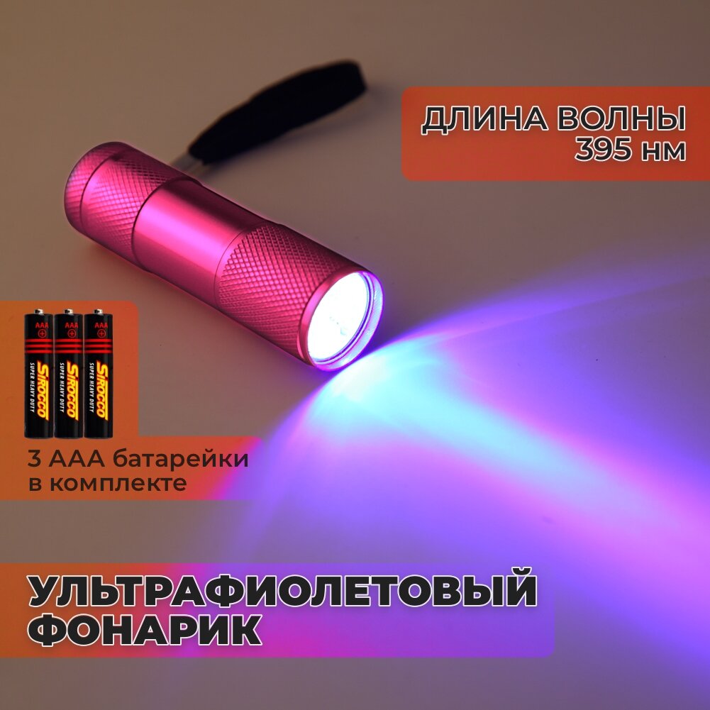 Купить Ультрафиолетовый фонарик 395nm 9LED для обнаружения органики и сушки лака и клея (розовый)
