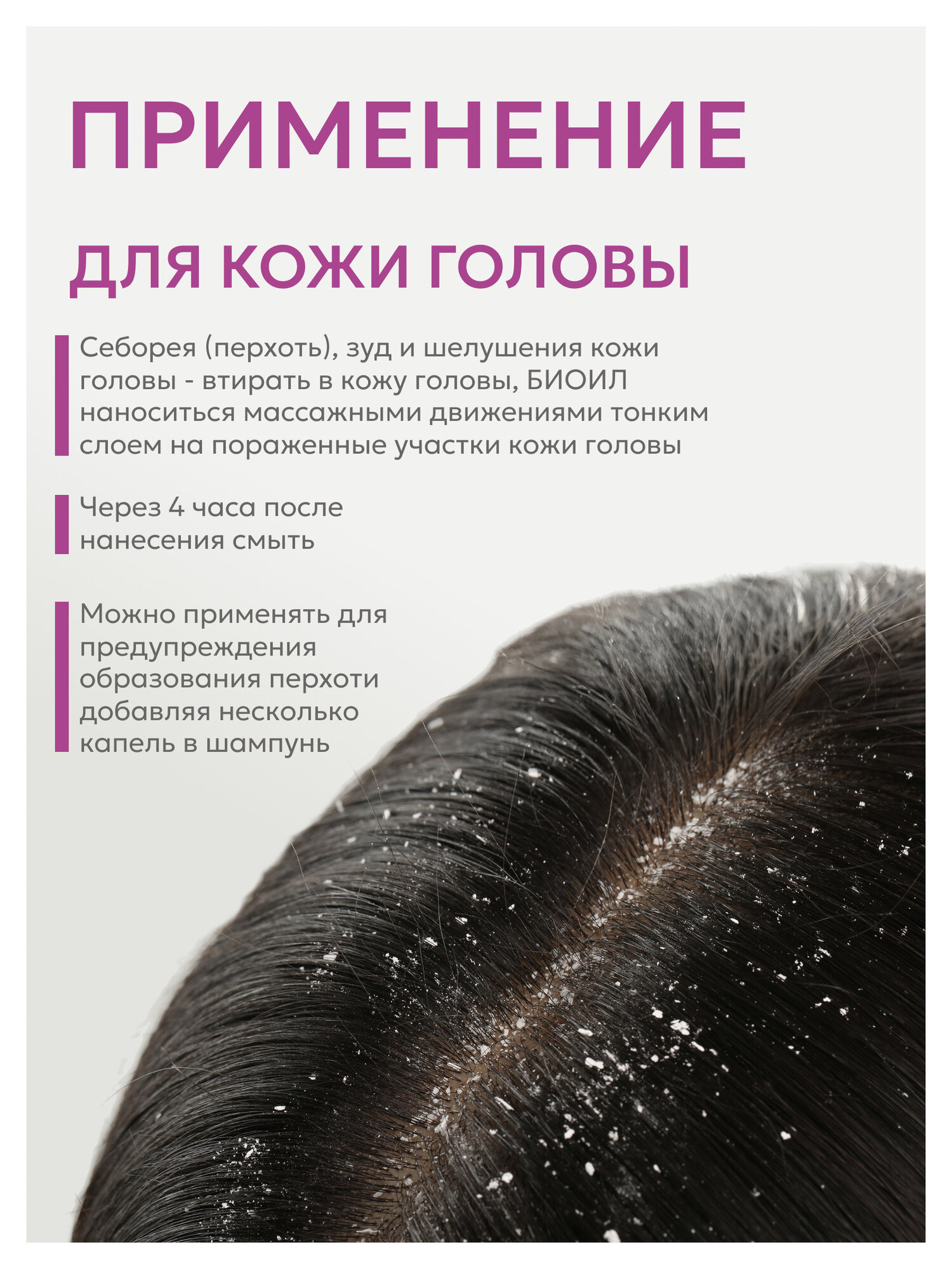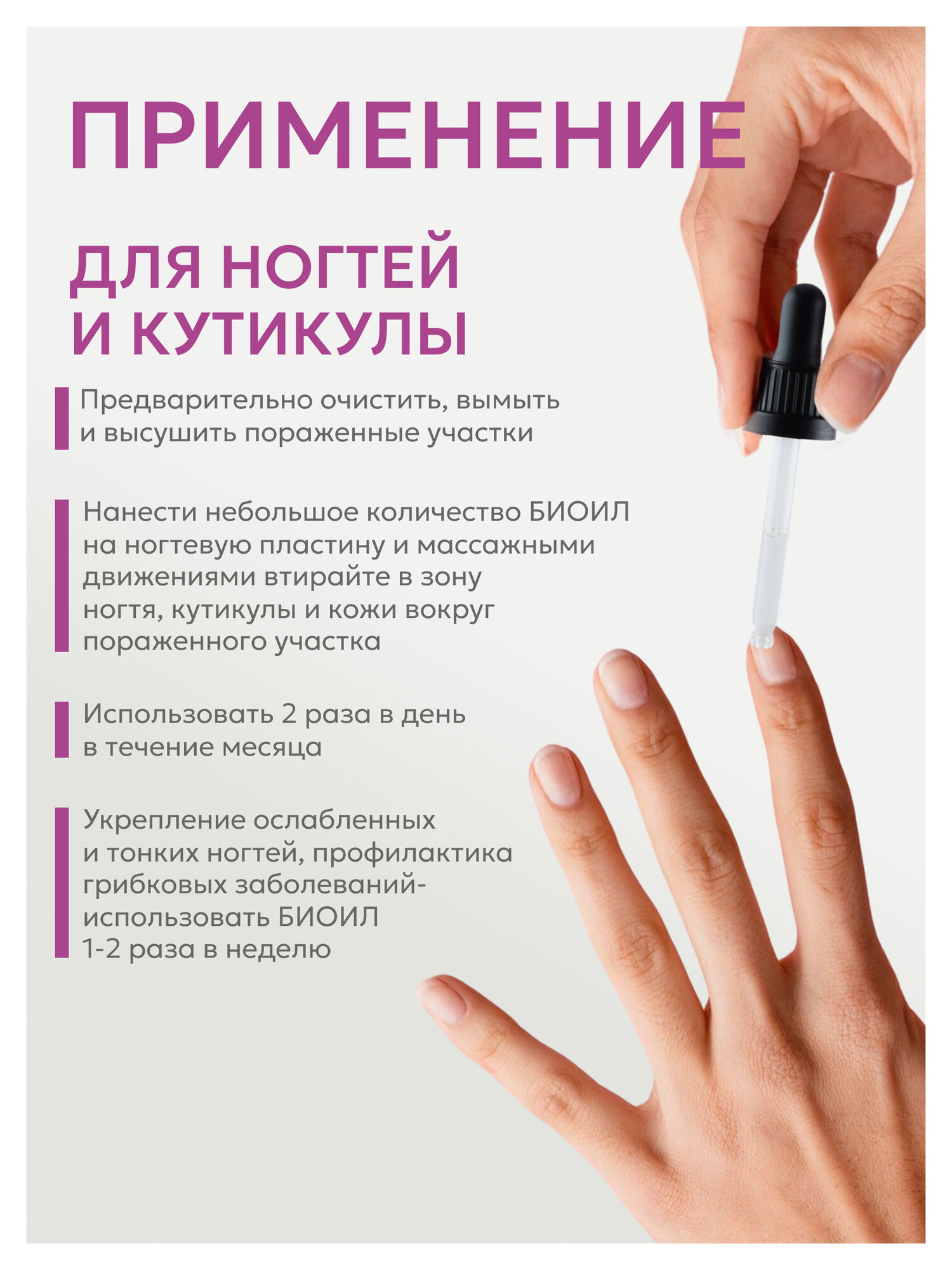 | Способ применения | Применение: Грибковое поражение ногтей- предварительно очистить, вымыть и высушить пораженные участки. Нанести небольшое количество Bioil на ногтевую пластину и массажными движениями втирайте в зону ногтя, кутикулы и кожи вокруг пораженного участка. Использовать 2 раза в день в течение месяца. Укрепление ослабленных и тонких ногтей, профилактика грибковых заболеваний- использовать Bioil 1-2 раза в неделю. Поражение кожного покрова при дерматитах, экземах, псориазе- Bioil наноситься массажными движениями тонким слоем на пораженные участки кожи. Использовать 2 раза в день в течение месяца. Себорея (перхоть), зуд и шелушения кожи головы-втирать в кожу головы, через 4 часа смыть. Можно применять для предупреждения образования перхоти. Укусы насекомых, акне-точечно нанесите небольшое количество средства на проблемный участок кожи. |