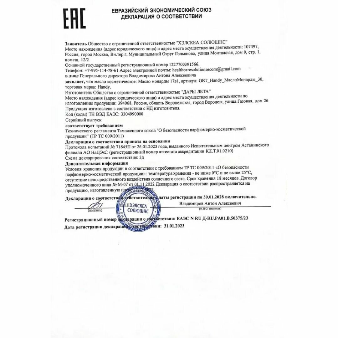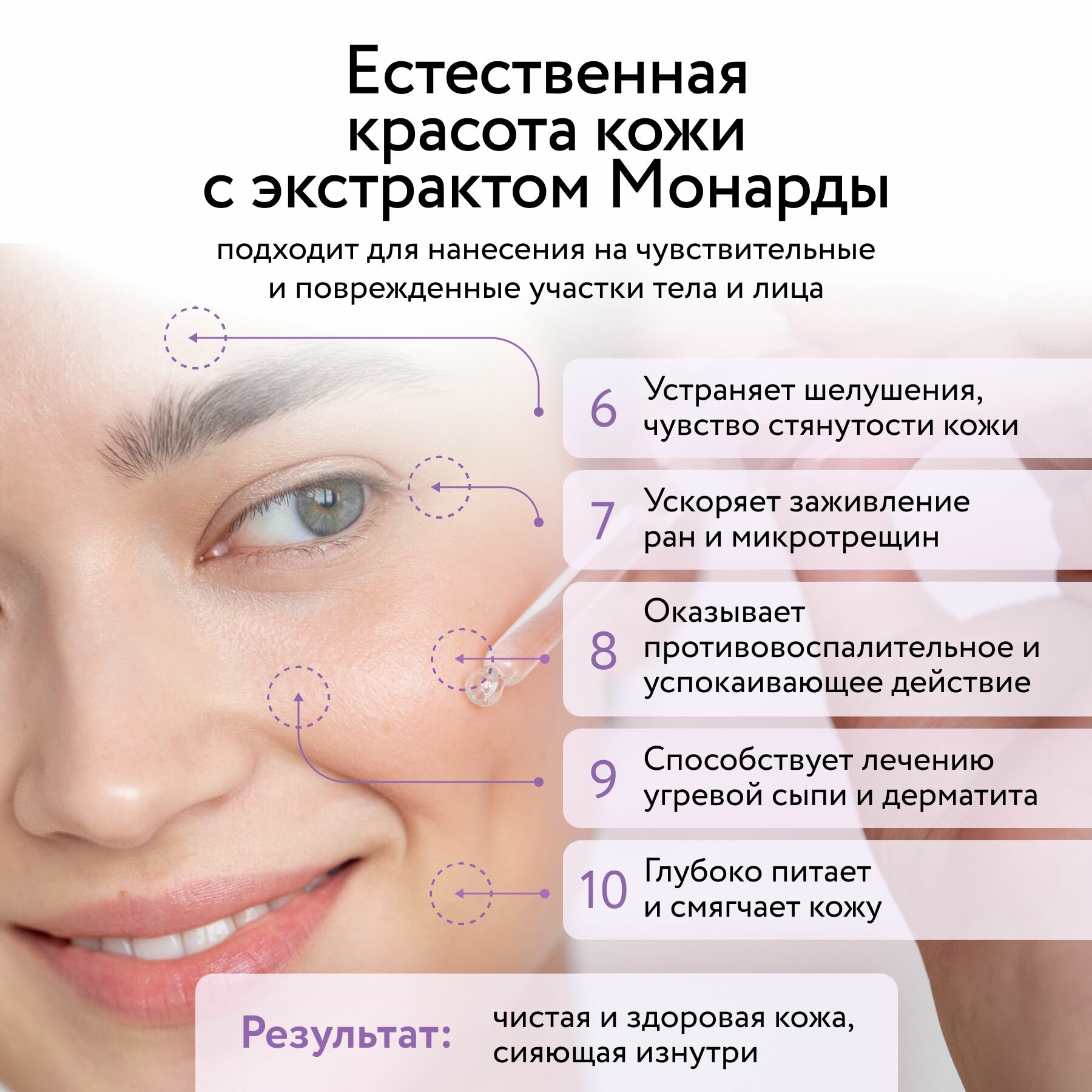| Состав | Экстракт монарды CO2 масляный, витамин Е. Особенности состава: без красителей, без спирта, без парабенов, без отдушек, натуральные экстракты, проверено дерматологами, органическая косметика, подходит для ежедневного применения |