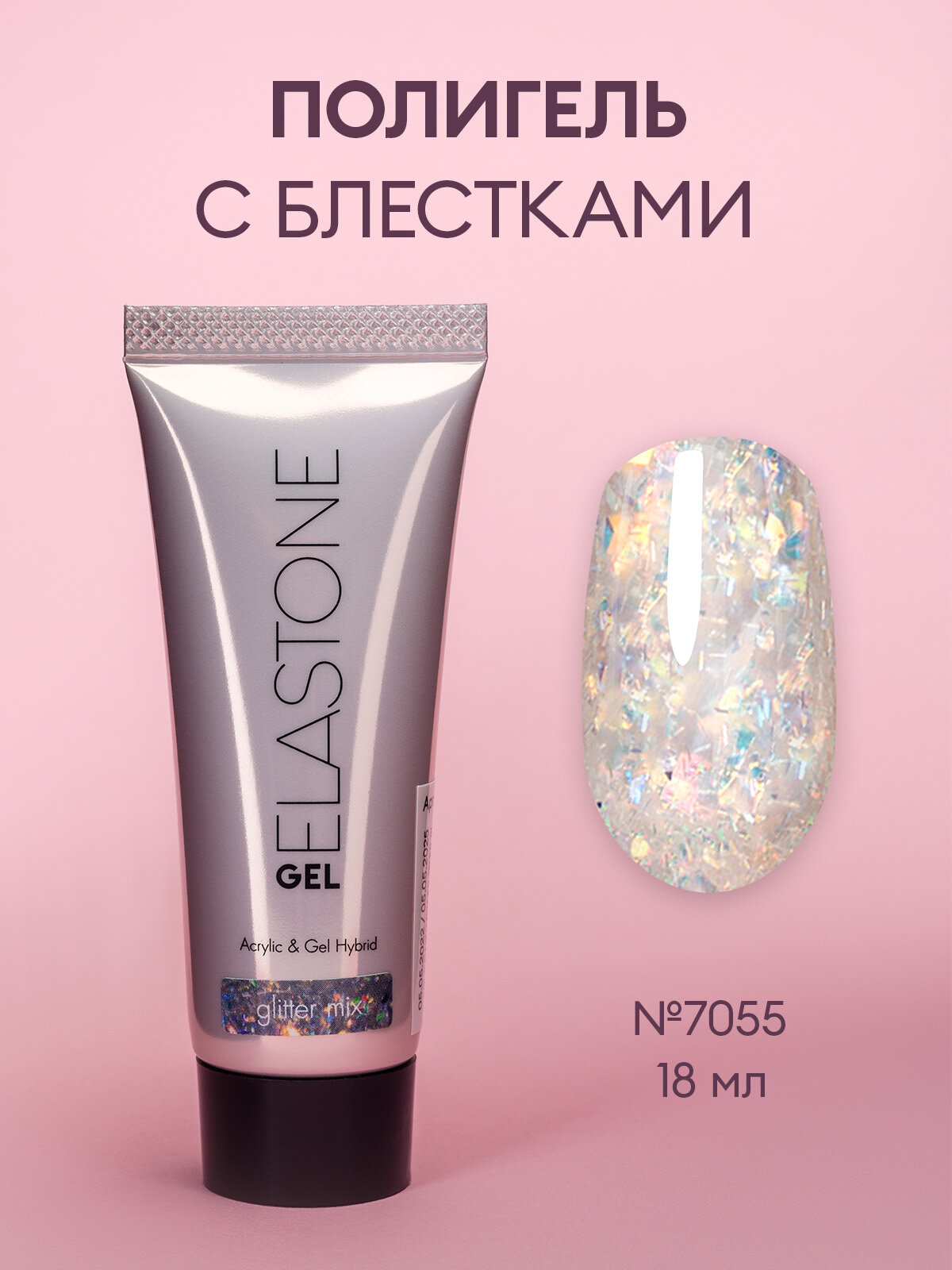 Купить Гибрид акрила и геля/акригель/полигель для наращивания ELASTONE GEL /полигель с блестками, 18 мл №7055