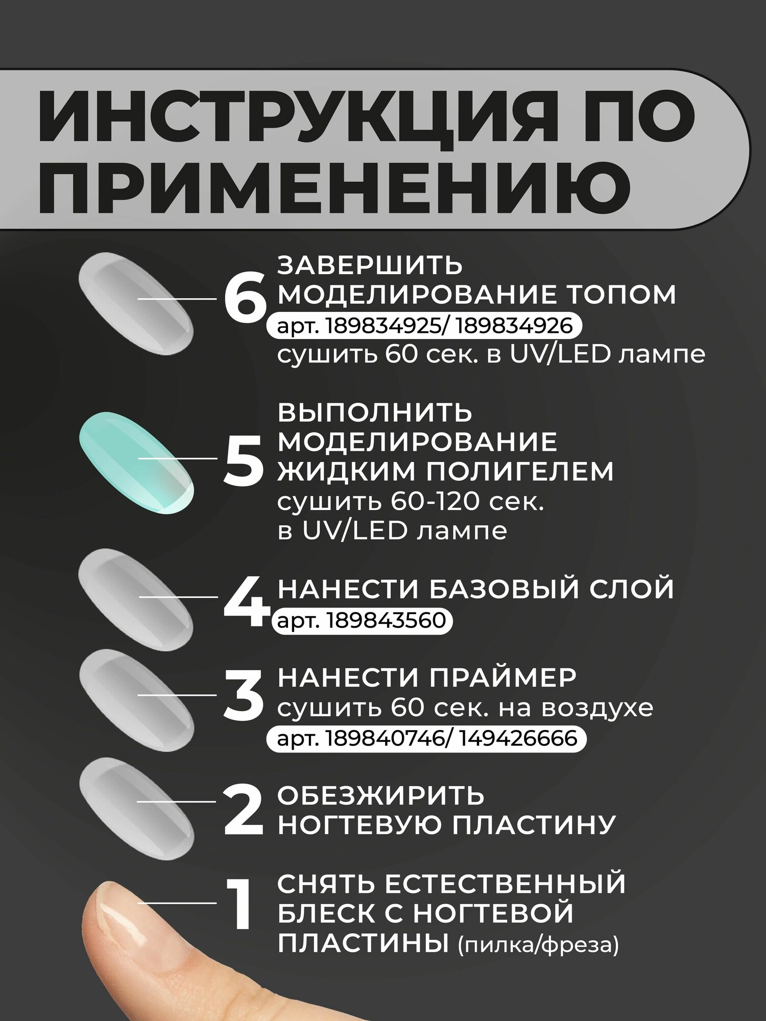 | Способ применения | Способ применения: нанести выравнивающим слоем, просушить в UV/LED лампе 60-120 секунд в зависимости от мощности и толщины слоя. *Рекомендуем для лучшей сцепки наносить жидкий акрилатик на подложку из прозрачной базы. |
