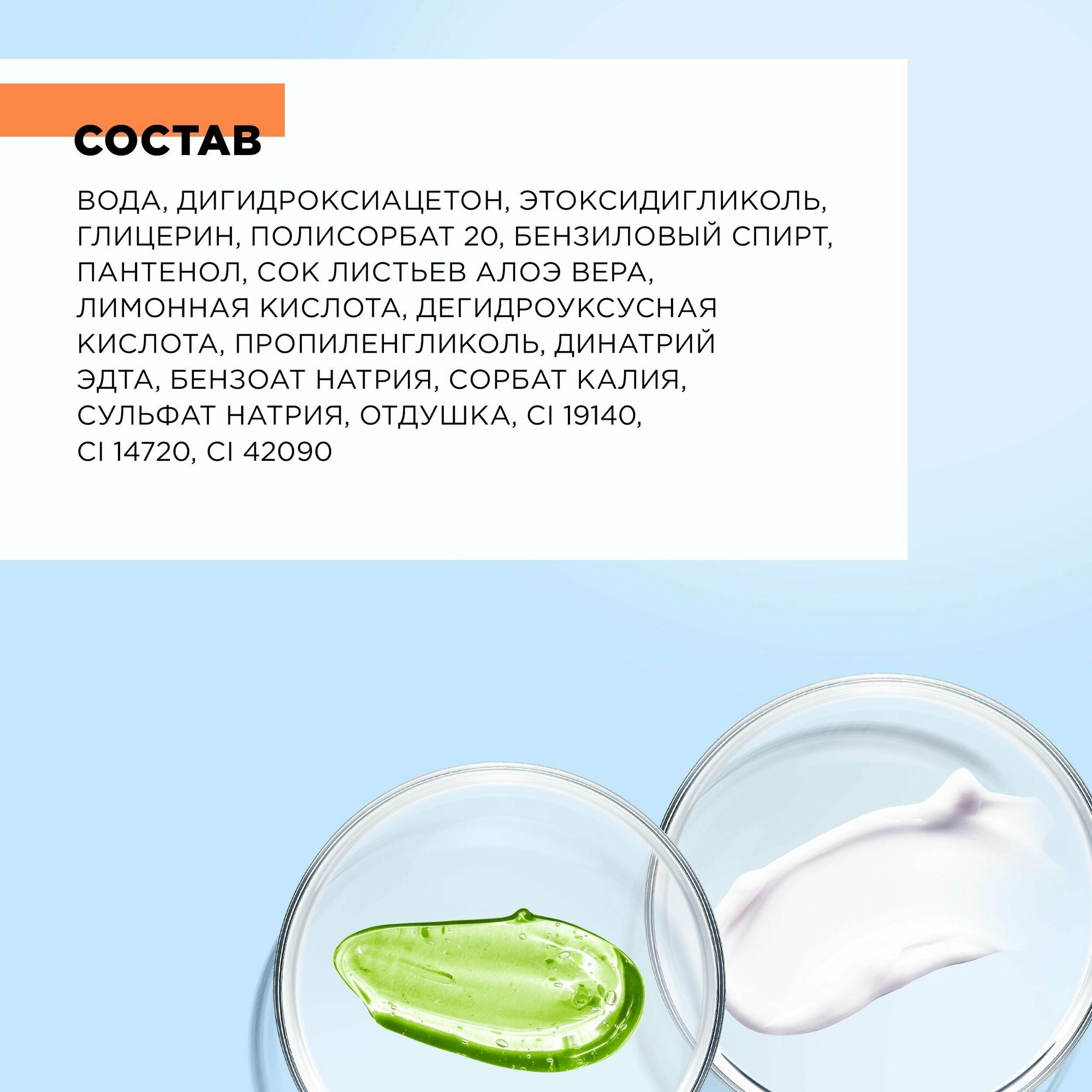 | Состав | Вода, глицерин, пропиленгликоль, дигидроксиацетон, пропандиол, бетаин, полисорбат-20, пантенол, гель алоэ-вера, лимонная кислота, парфюмерная композиция, 1,2-гександиол, каприлгидроксаминовая кислота, калия сорбат, натрия бензоат, CI: 14720, 19140, 42090. |