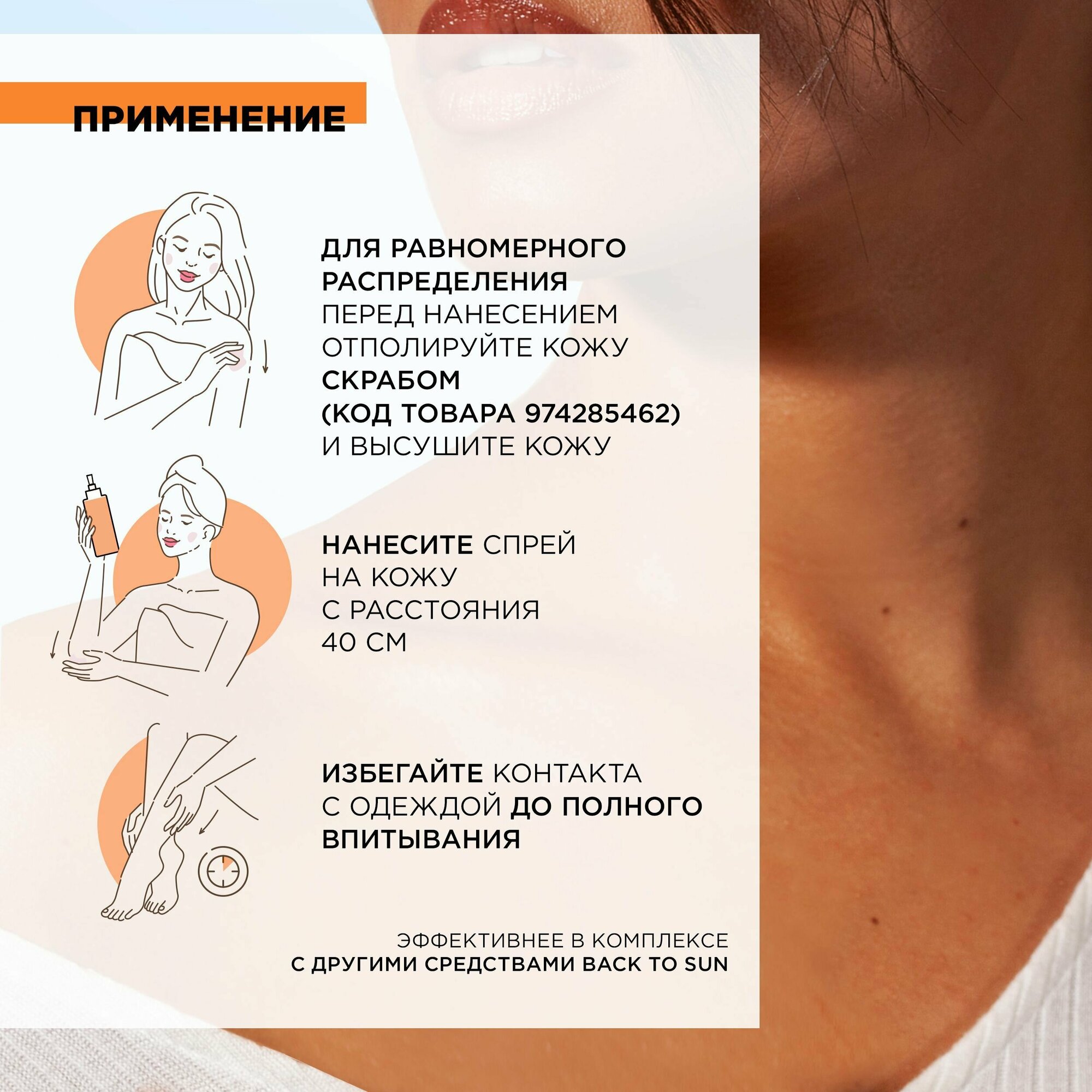 | Способ применения | равномерно распредилить средство средство по коже с расстояния 40 см, дождаться полного впитывания. С каждым применением тон становится глубже, позволяя достичь нужного оттенка. Для поддержания идеального тона использовать спрей 2-3 раза в неделю. |