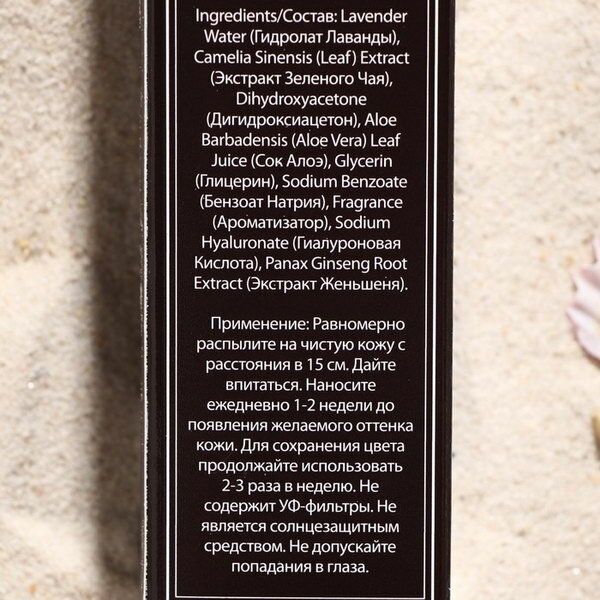 | Состав | Lavender Water (Гидролат Лаванды), Camelia Sinensis (Leaf) Extract (Экстракт Зеленого Чая), Dihydroxyacetone (Дигидроксиацетон), Aloe Barbadensis (Aloe Vera) Leaf Juice (Сок Алоэ), Glycerin (Глицерин), Sodium Benzoate (Бензоат Натрия), Fragrance (Ароматизатор), Sodium Hyaluronate (Гиалуроновая Кислота), Panax Ginseng Root Extract (Экстракт Женьшеня) |