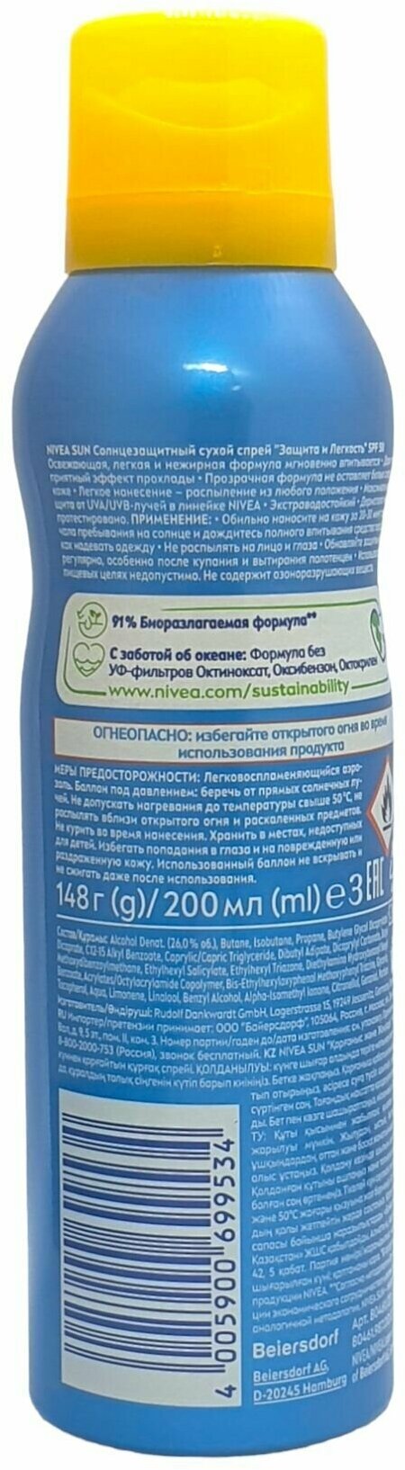 Nivea Sun солнцезащитный сухой спрей Защита и легкость SPF 50 200 мл 191 г интересное: