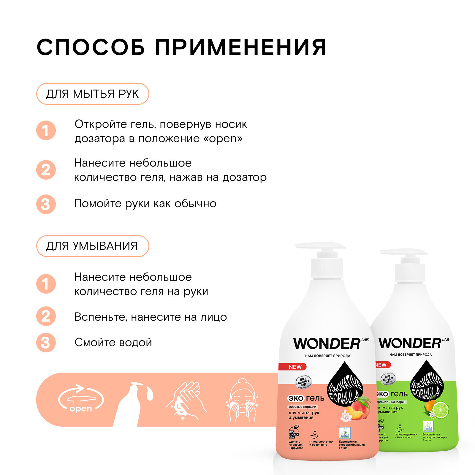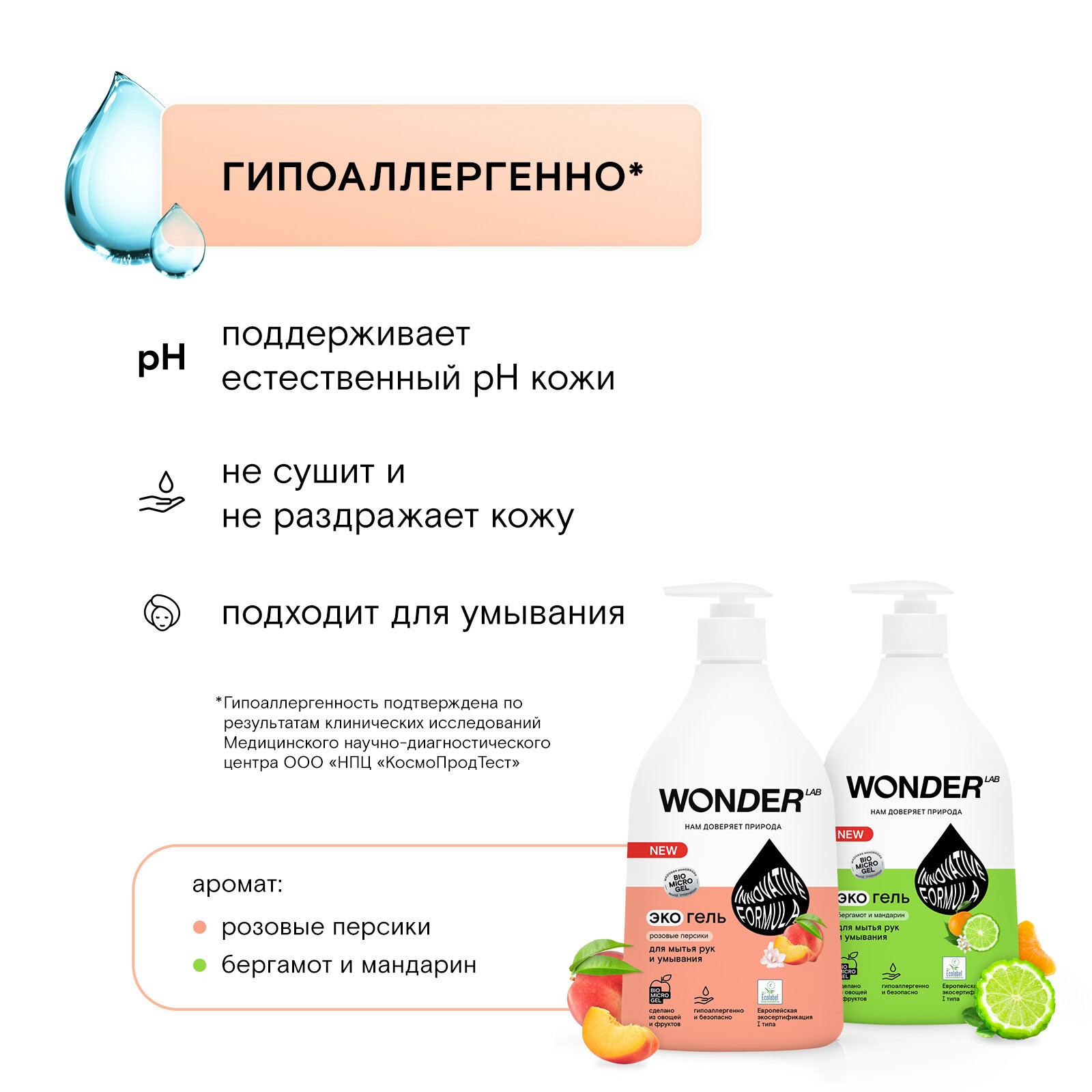 WONDER LAB Экогель для рук и умывания, розовые персики, 0,54 л