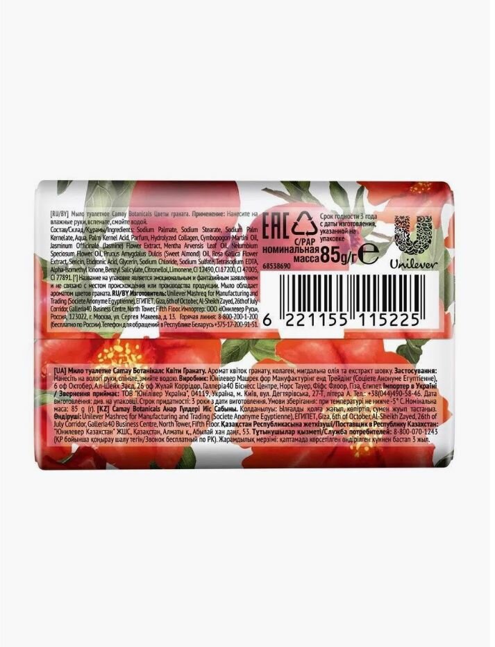 CAMAY BOTANICALS туалетное мыло с натуральными экстрактами и маслами цветы граната для всех типов кожи 85 гр