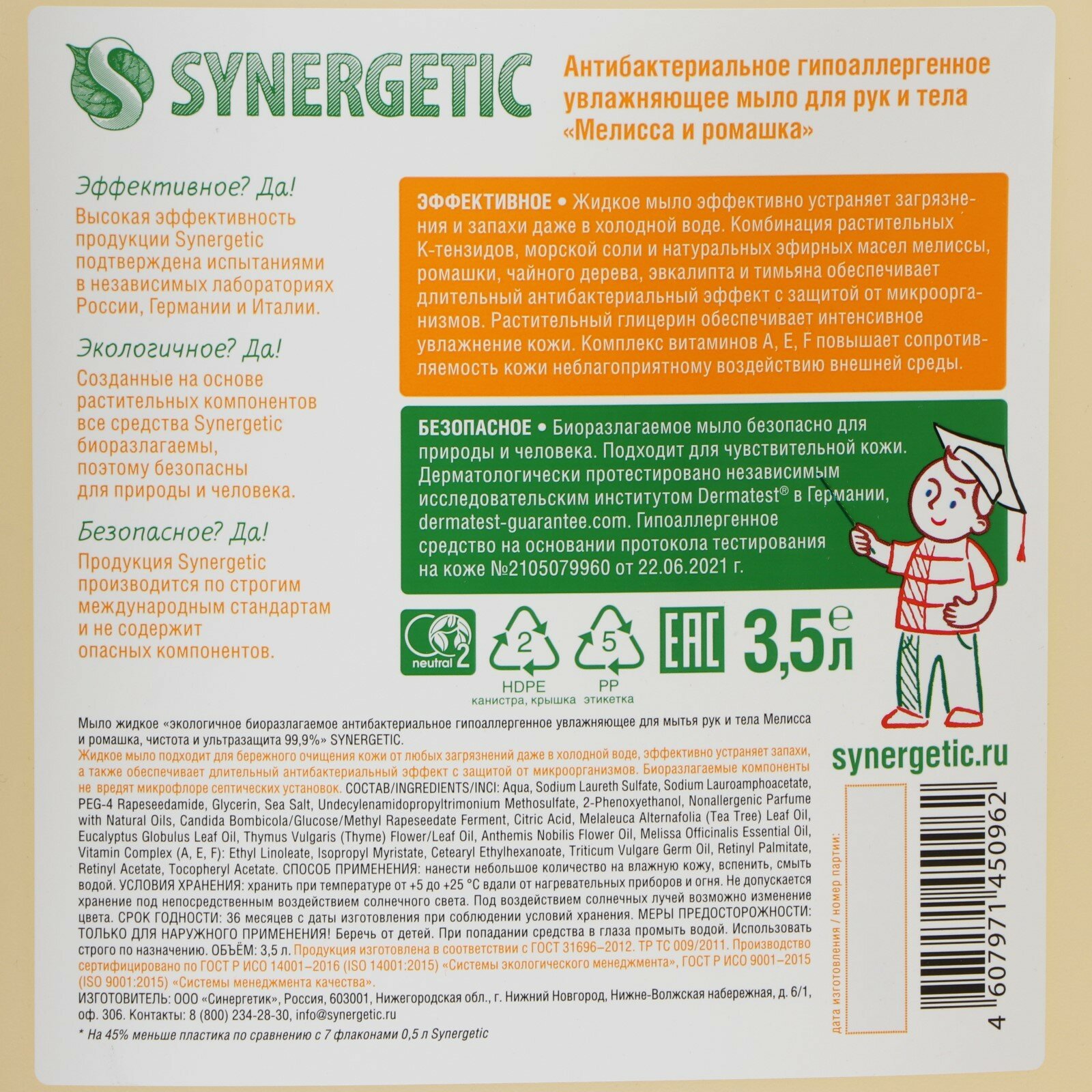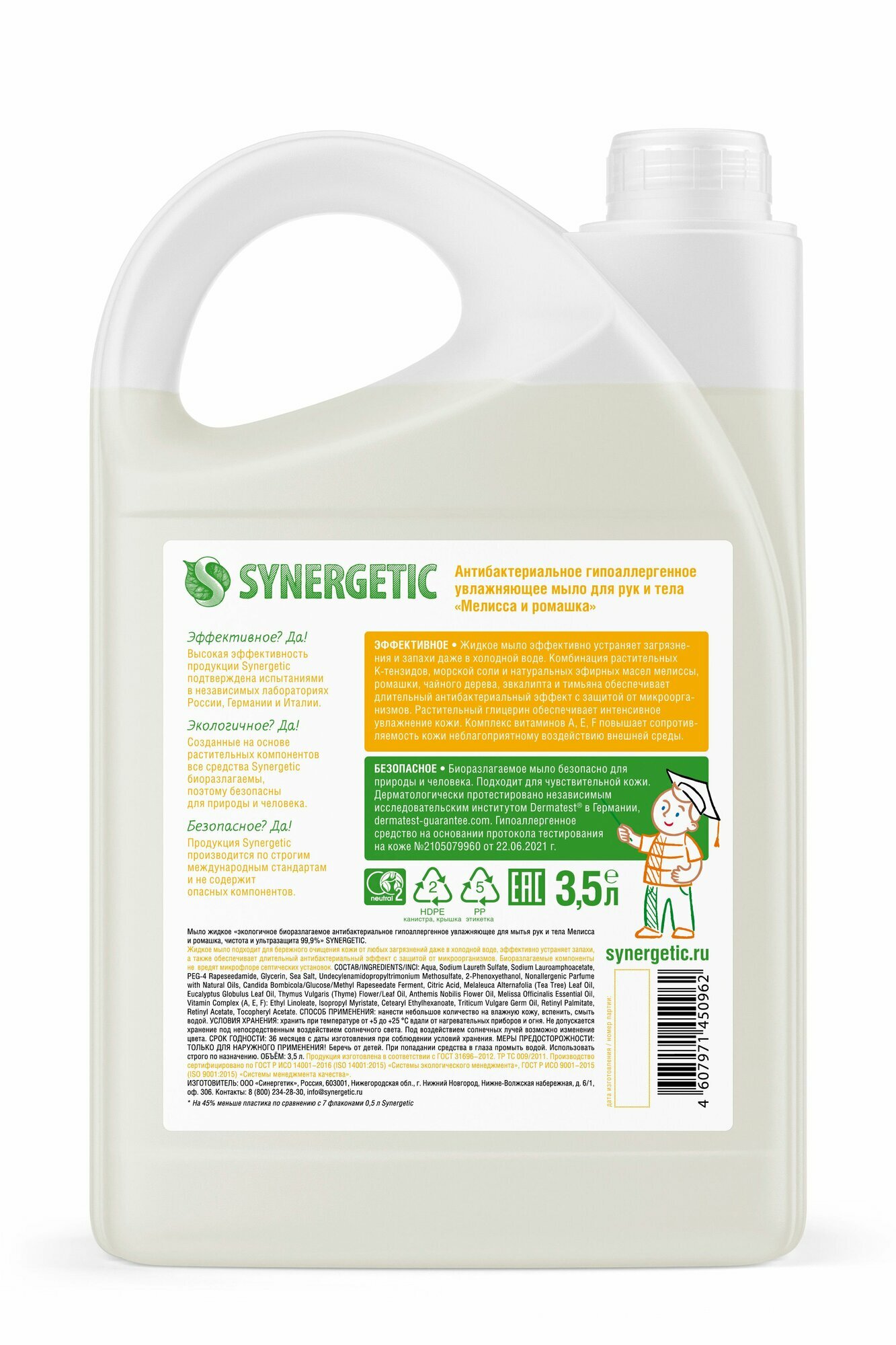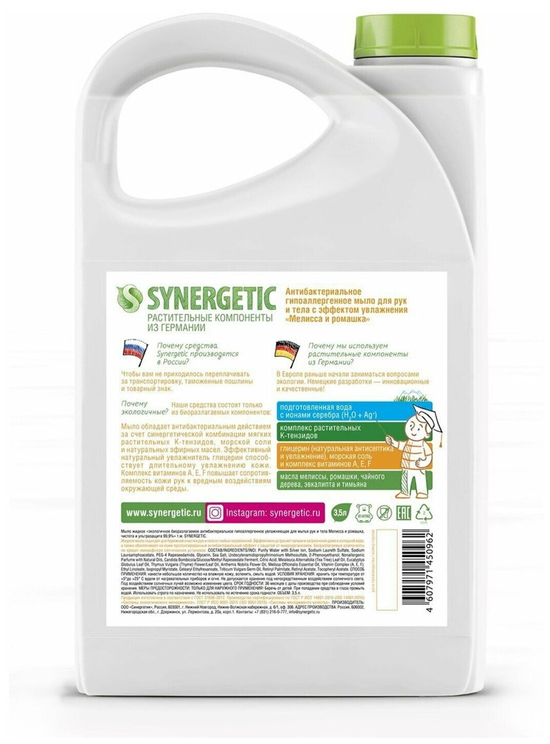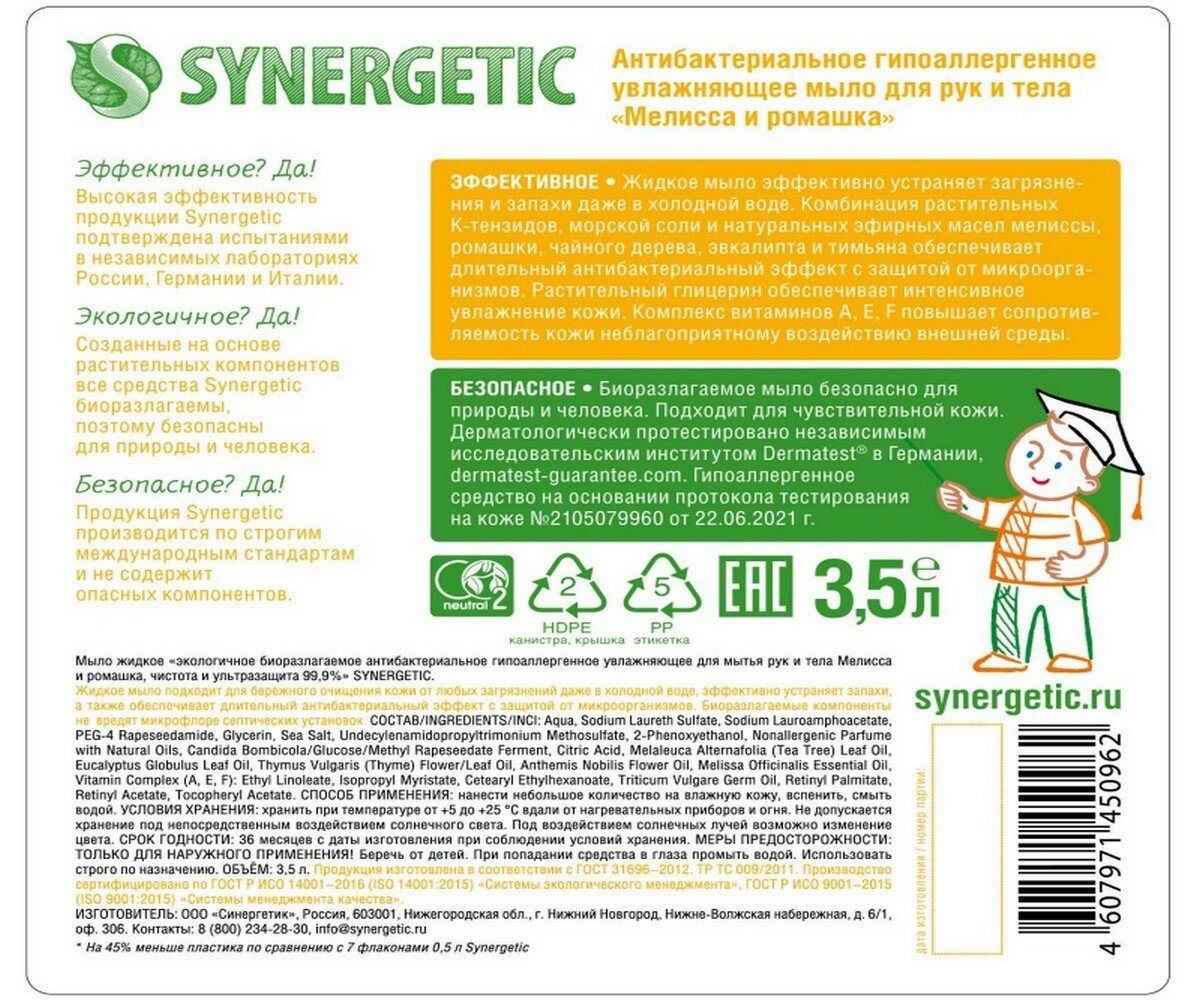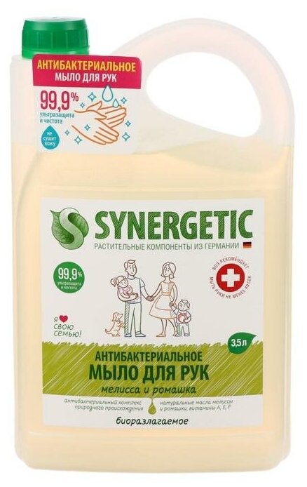 Ниже Вы можете прочитать отзывы на Мыло жидкое Synergetic Антибактериальное Мелисса и ромашка 3,5л, ознакомится с подробными характеристиками, посмотреть интересные обзоры и фотографии на Мыло жидкое Synergetic Антибактериальное Мелисса и ромашка 3,5л.