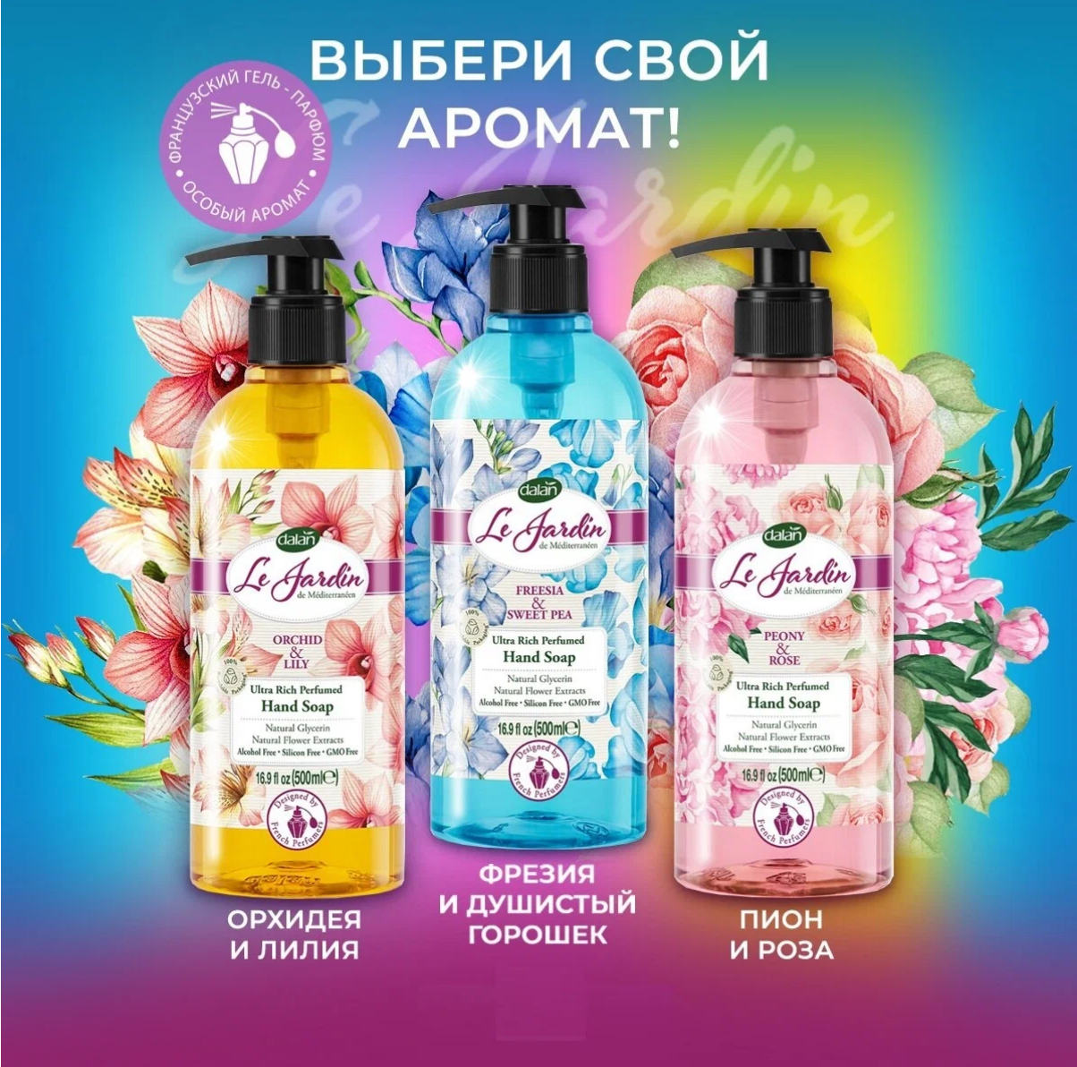 Натуральное турецкое жидкое мыло для рук Dalan Le Jardin туалетное Пион, Орхидея, Фрезия, парфюмированное, набор мыла подарочный 500 мл х 3 шт