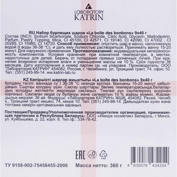 | Состав | Sodium bicarbonate, Sodium Chloride, Citric Acid, Glycerin, Maltodextrin, Parfum, Pastry Topping, Mica, CI 14720, СI 15985, СI 42090, СI 19140, CI 20285, CI 45100, CI 42571, CI 47002 |