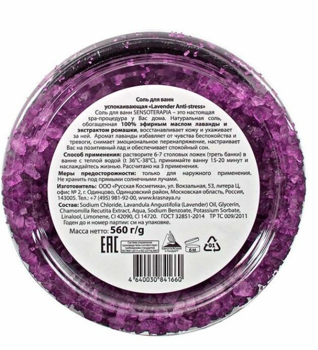 Соль для ванн Senso Terapia "Lavender Anti-Stress", успокаивающая, натуральная, фиолетовая, 560г