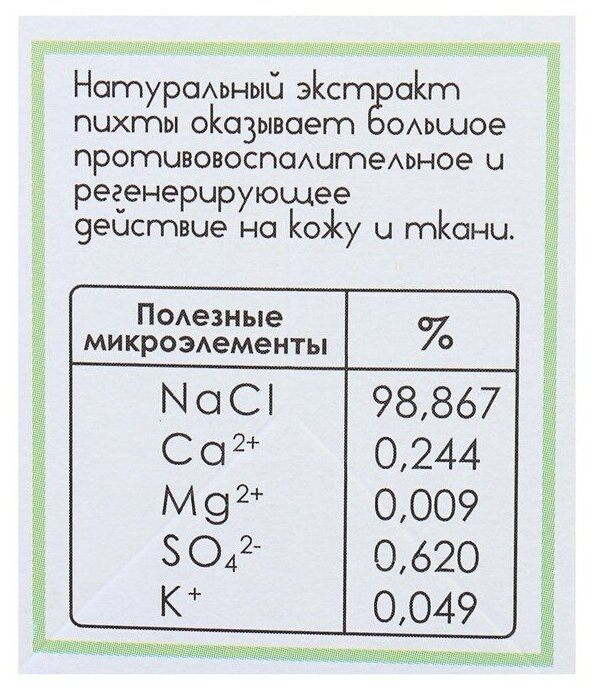 | Состав | соль природная (хлорид натрия), отдушка, натуральный экстракт календулы, CI 19140. |