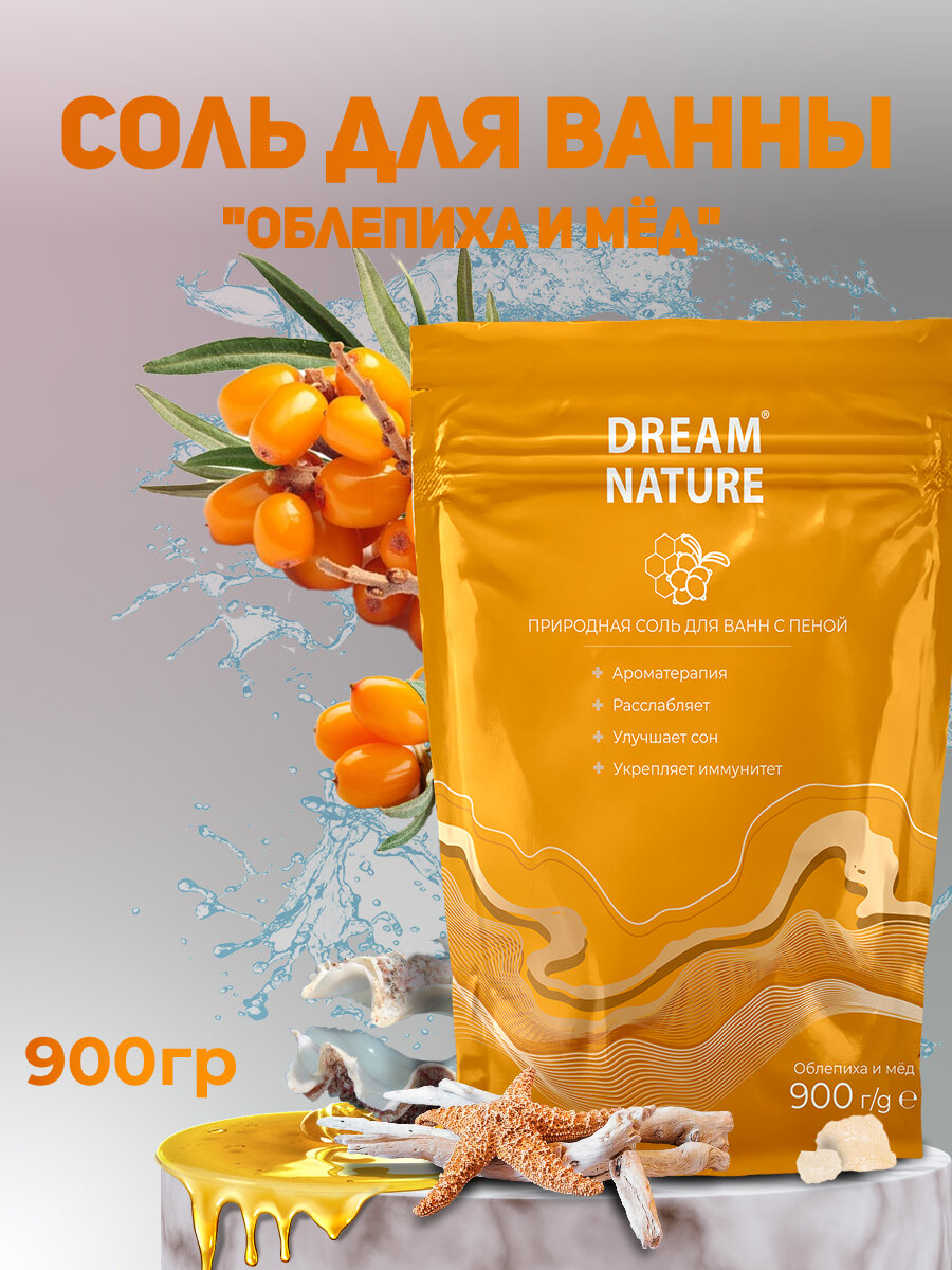 Соль для ванн морская с пеной Dream Nature с ароматом облепихи и меда, 900 гр
