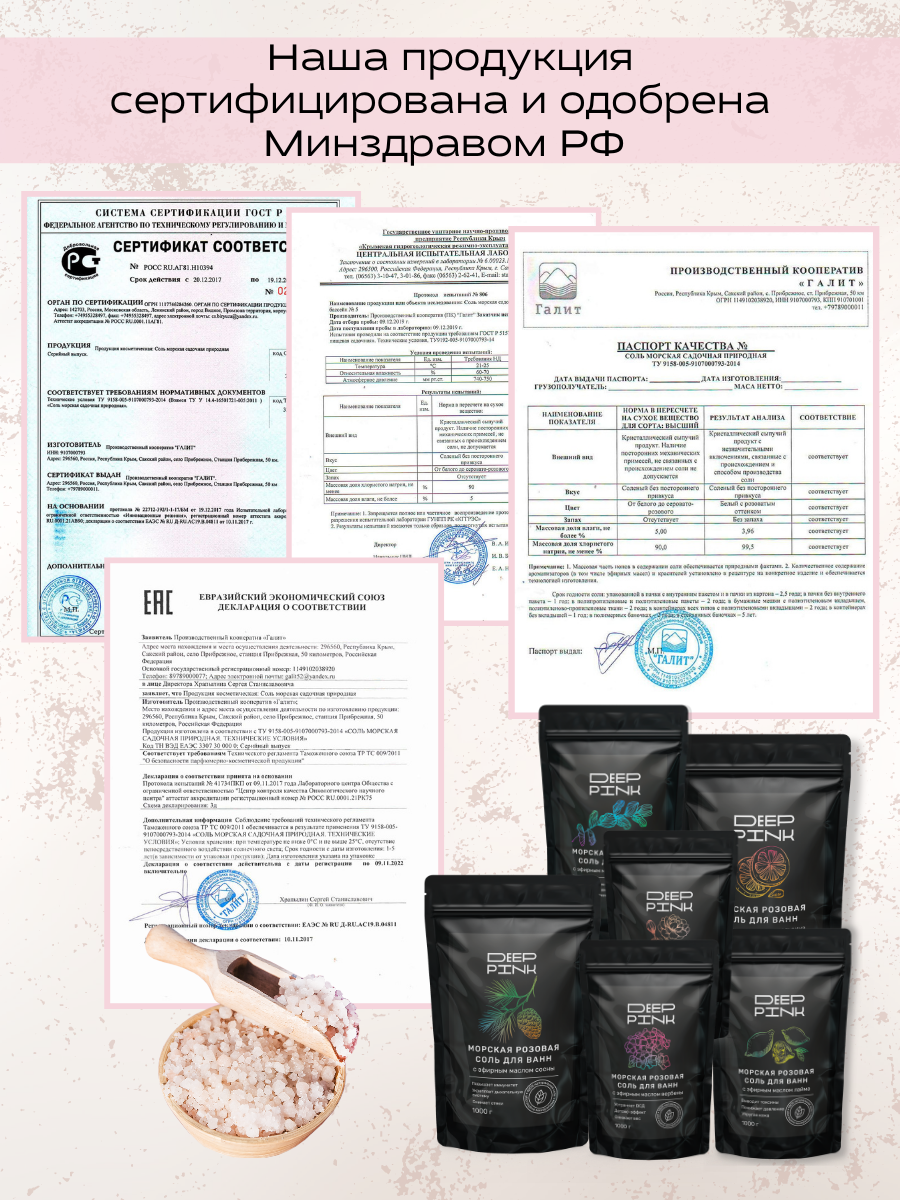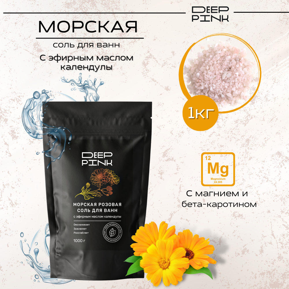 Deep Pink, Крымская морская розовая соль для ванн с эфирным маслом Календулы/ повышает эластичность кожи / снимает отеки / 1000 г. интересное: