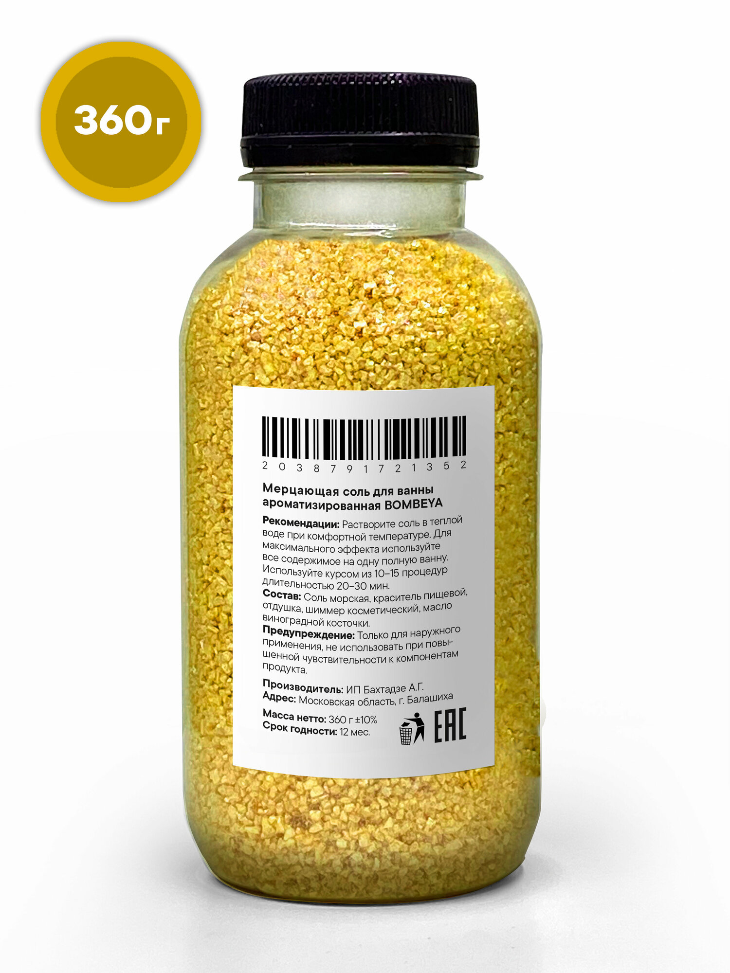 | Состав | морская соль, краситель пищевой, отдушка, пищевой шиммер, масло виноградной косточки |