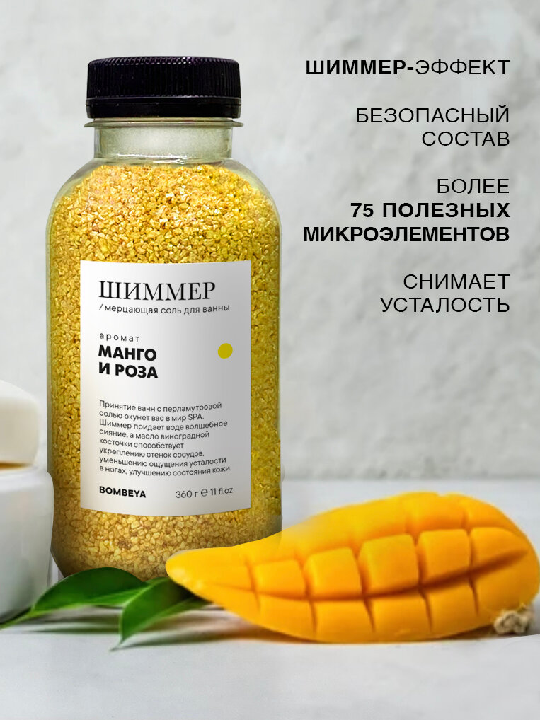 Мерцающая морская соль шиммер Bombeya для ванны с ароматом "Манго и Роза", 360 г. интересное: