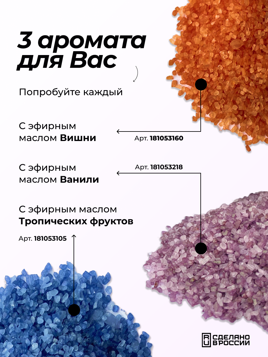 | Состав | Морская соль, краситель пищевой, отдушка, масло виноградной косточки |