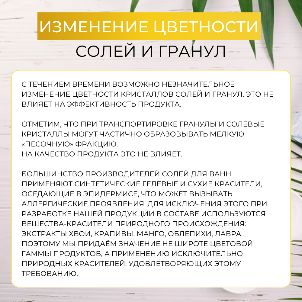 | Состав | Соль морская, соль озёрная, повышенное содержание экстрактов ромашки аптечной, календулы, липы, мать-и-мачехи, эвкалипта, экстракт лечебной грязи. |