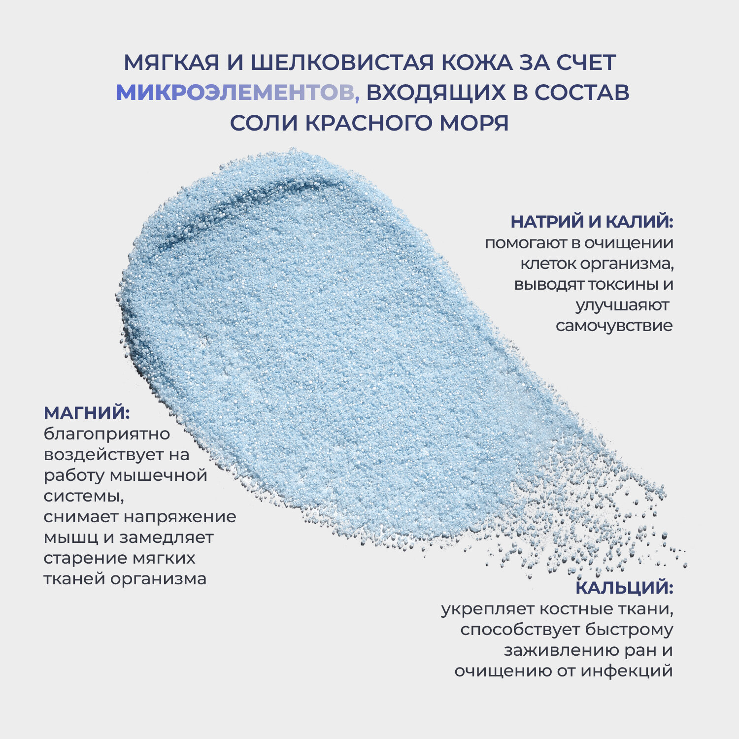 | Состав | соль морская, хлорид магния, хлорид кальция, пигмент перламутровый, хлорид калия, диоксид кремния, гидрокарбонат натрия, хлорид стронция, краситель, ароматизатор, бензоат натрия, йодат калия. |