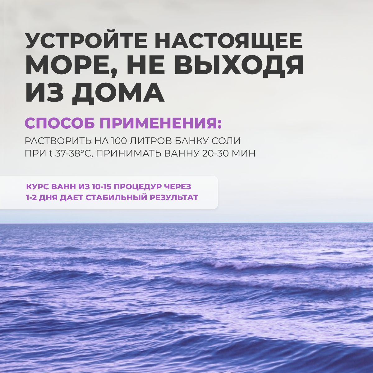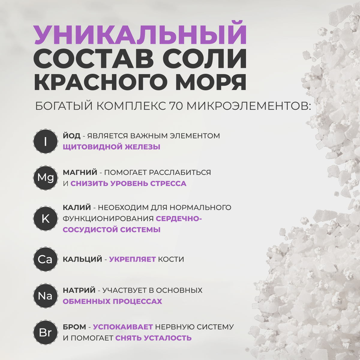 | Состав | соль морская, хлорид магния, хлорид кальция, пигмент перламутровый, хлорид калия, диоксид кремния, гидрокарбонат натрия, хлорид стронция, краситель, ароматизатор, бензоат натрия, йодат калия. |