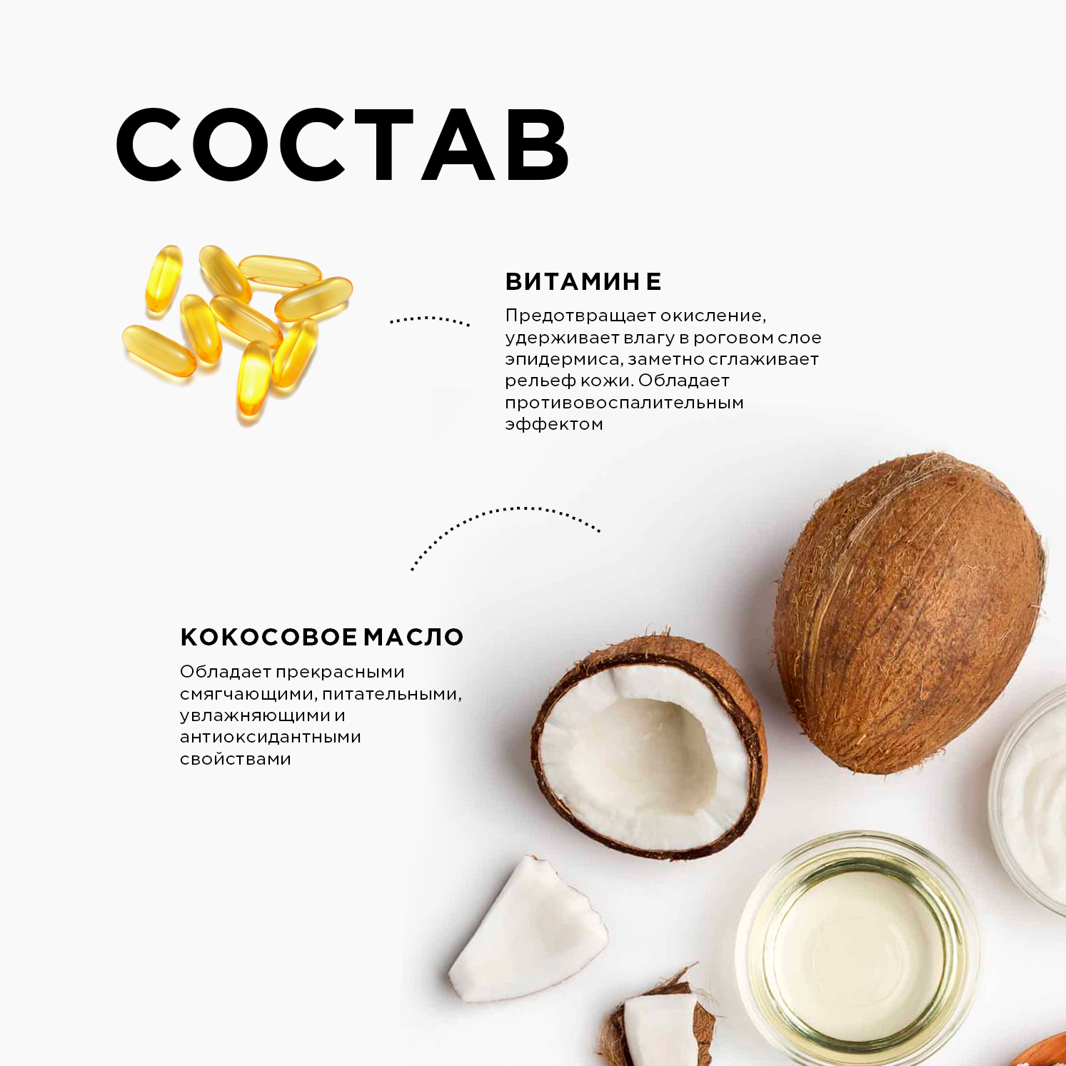| Масла и экстракты | кокосовое масло / масло авокадо / масло виноградной косточки / масло жожоба / масло ши (карите) / миндальное масло / экстракт гибискуса |
