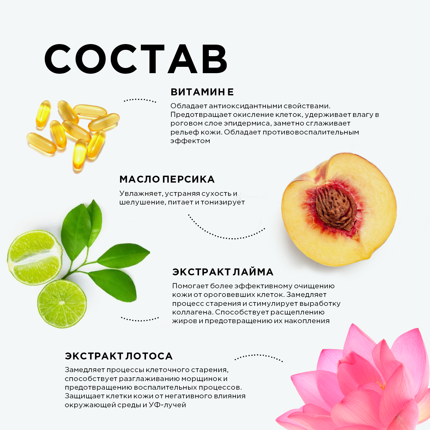 | Масла и экстракты | кокосовое масло / масло авокадо / масло виноградной косточки / масло жожоба / масло ши (карите) / миндальное масло / экстракт гибискуса |