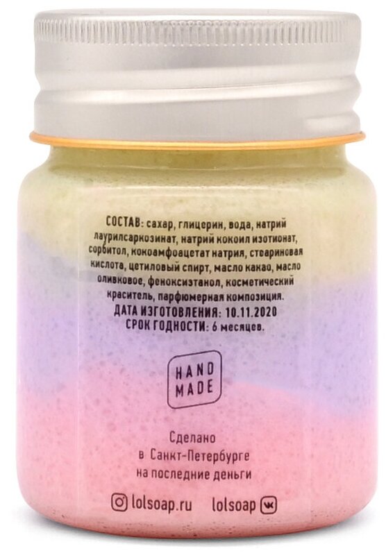 | Состав | Сахар, глицерин, вода, натрий лаурилсаркозинат, натрий кокоил изотионат, сорбитол, кокоамфоацетат натрия, стеариновая кислота, цетиловый спирт, масло какао, масло оливковое, феноксиэтанол, перламутровый пигмент, краситель, парфюмерная композиция |