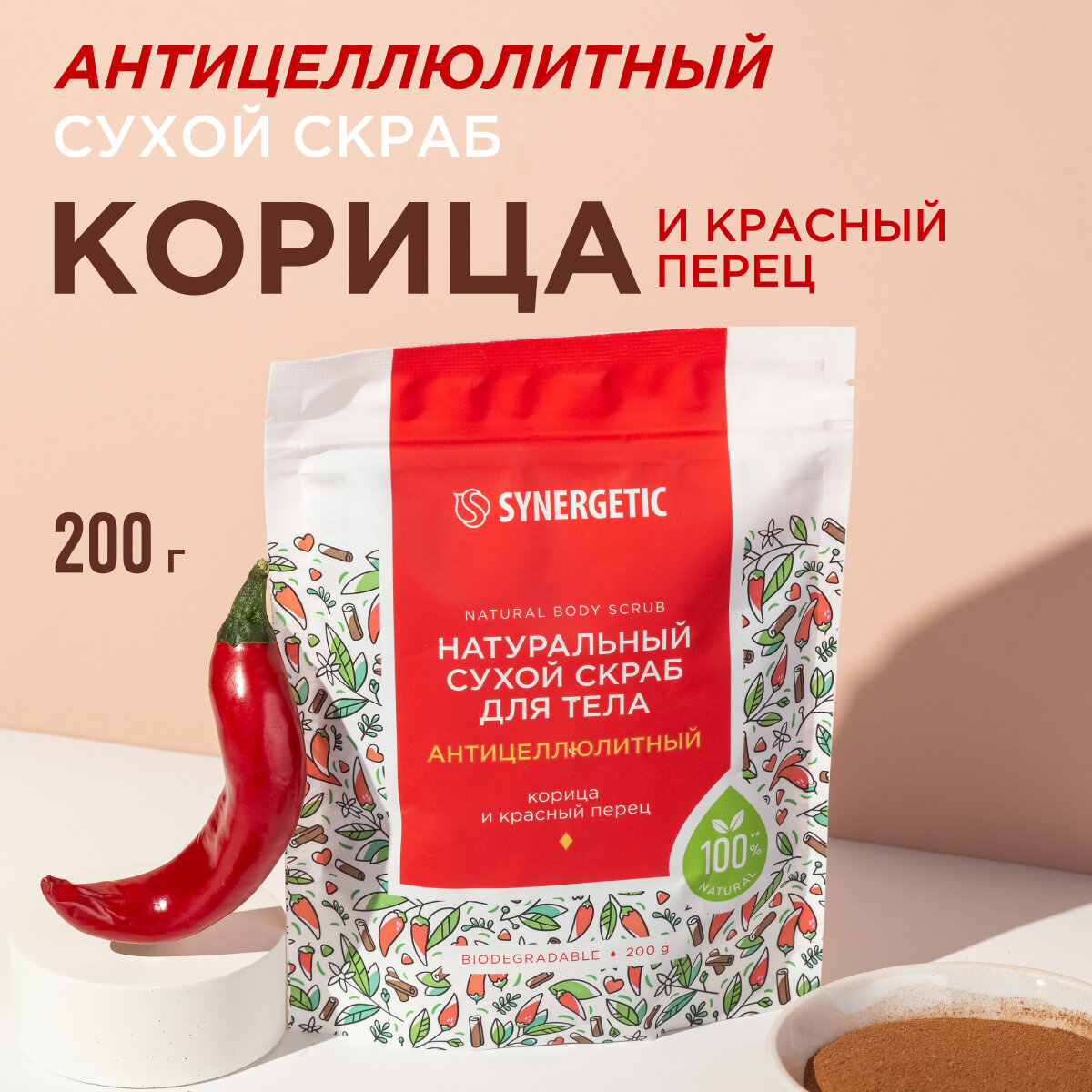 СохранитьНатуральный сухой скраб для тела SYNERGETIC антицеллюлитный, 200гр интересное: