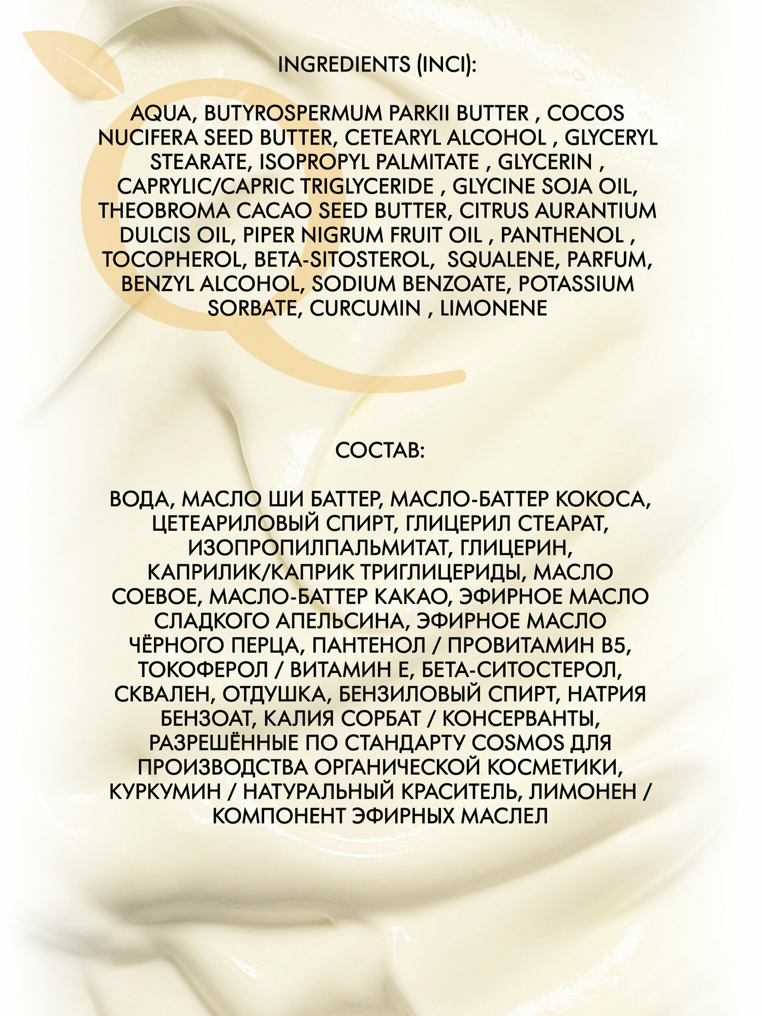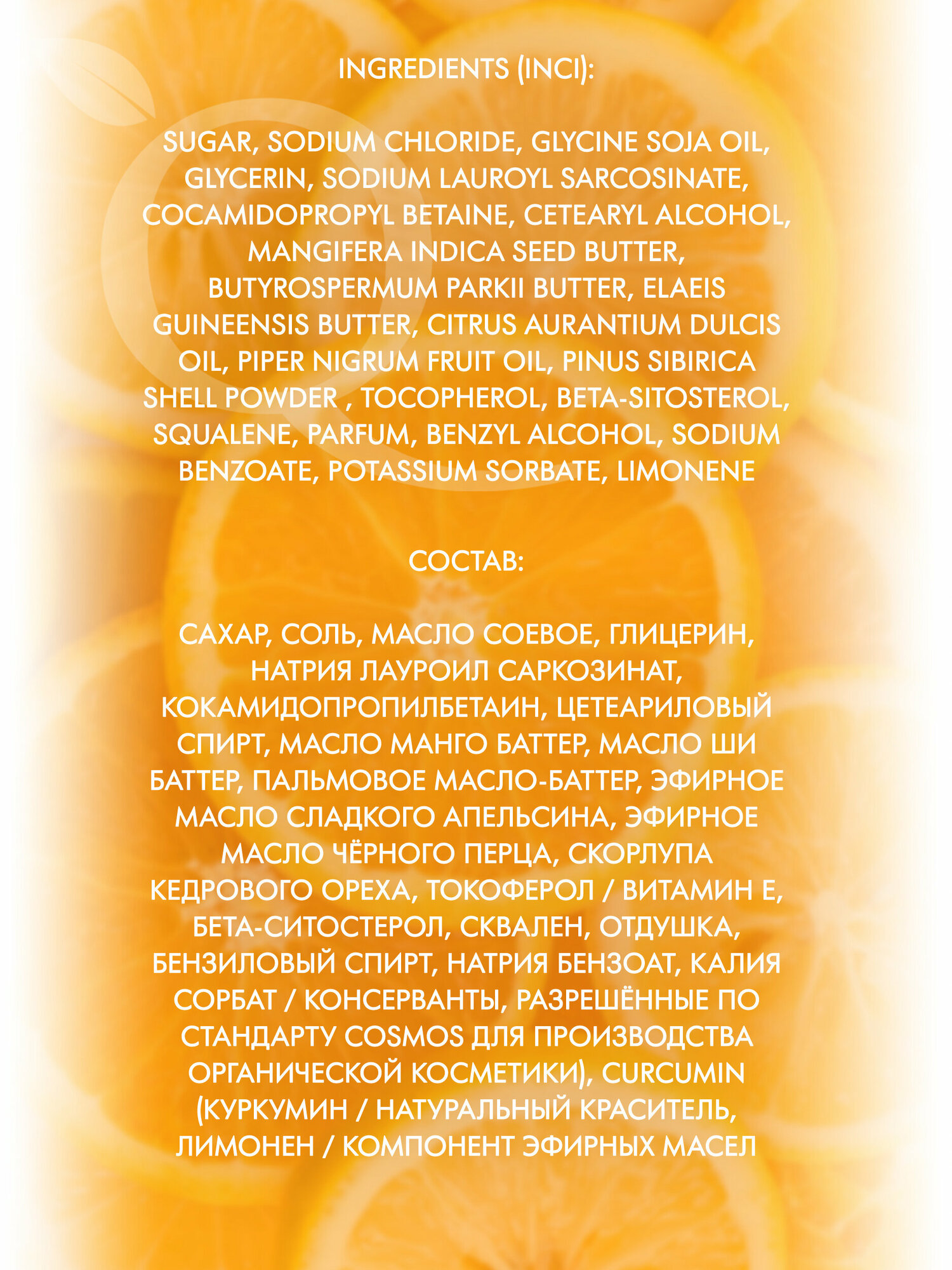 | Способ применения | Нанести на влажное тело и помассировать кожу в течение 1-2 минут, позволяя частичкам скраба легко перемещаться по её поверхности и медленно таять. Смыть тёплой водой. Не использовать на коже лица. Рекомендуется применять 1-2 раза в неделю после сауны или ванны, когда кожа податлива и ороговевшие клетки легко удаляются. Для предотвращения вросших волосков скрабирование желательно проводить перед депиляцией. Избегать использования на проблемной и гиперчувствительной коже, не наносить на повреждённые участки (ранки, царапины). После скраба, в качестве дополнительного ухода, нанести на кожу крем-баттер для лица и тела 25% масел ИНДЕКС НАТУРАЛЬНОСТИ. |