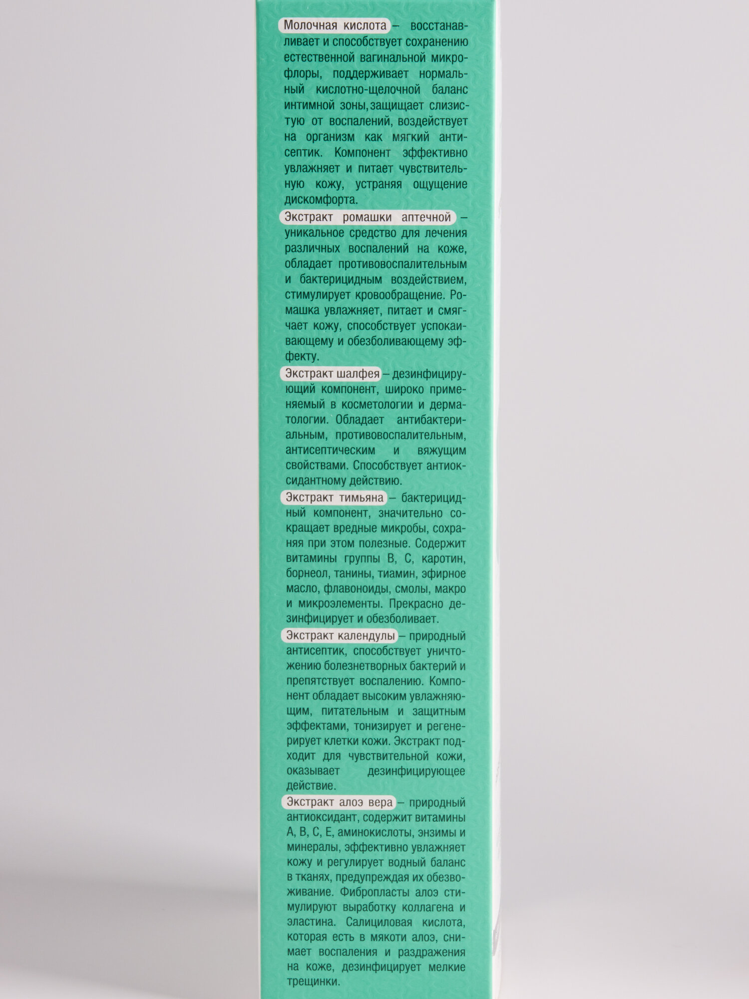 | Способ применения | Нанести немного средства на ладонь, распределить мусс в интимной области по направлению спереди назад, смыть проточной водой. Рекомендуется использовать 2 раза в день. |