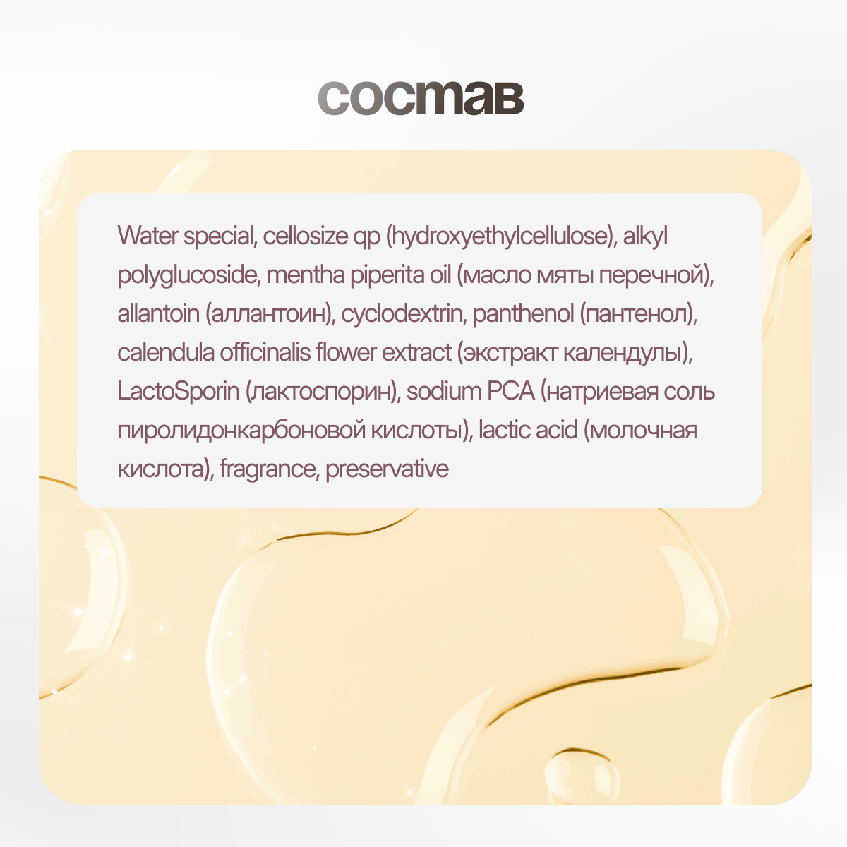 | Состав | water special, cellosize qp (hydroxyethylcellulose), alkyl polyglucoside, tea tree oil, allantoin, panthenol, extractum florum chamomillae officinalis, LactoSporin, sodium hyaluronate, lactic acid, fragrance, preservative |