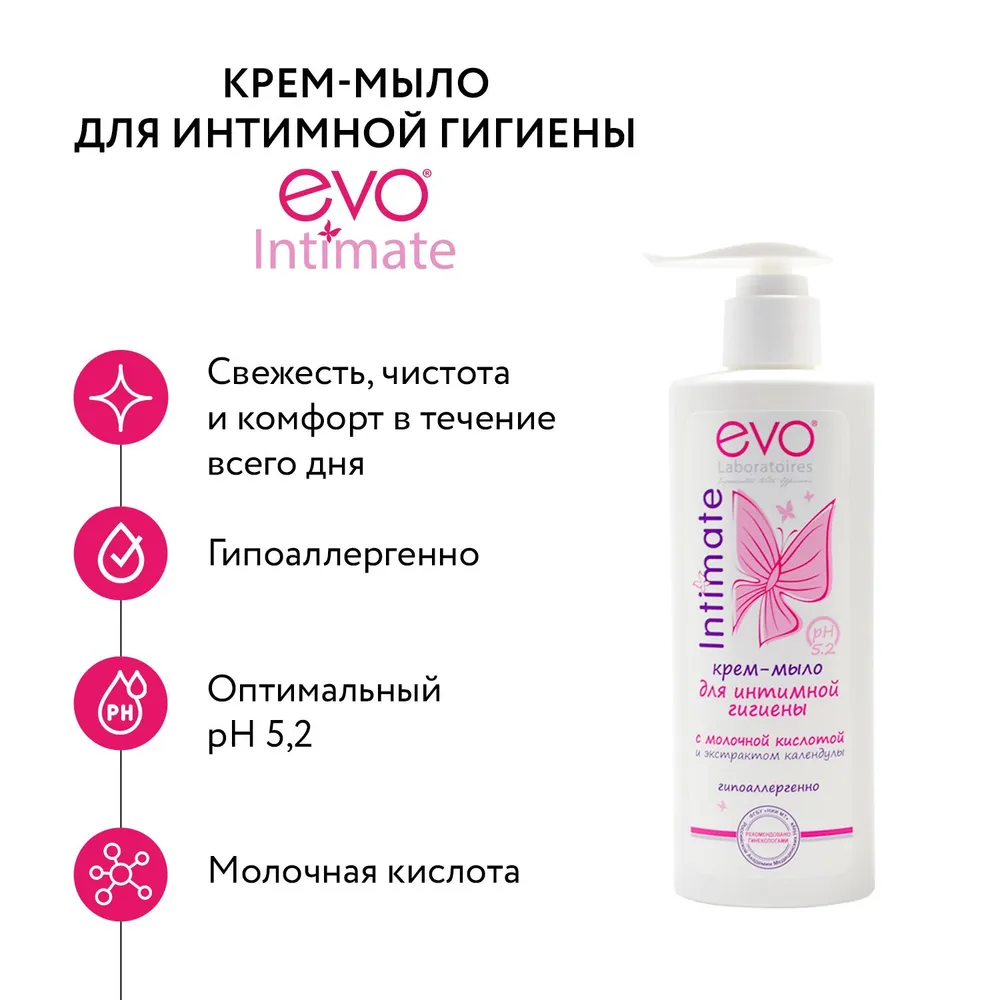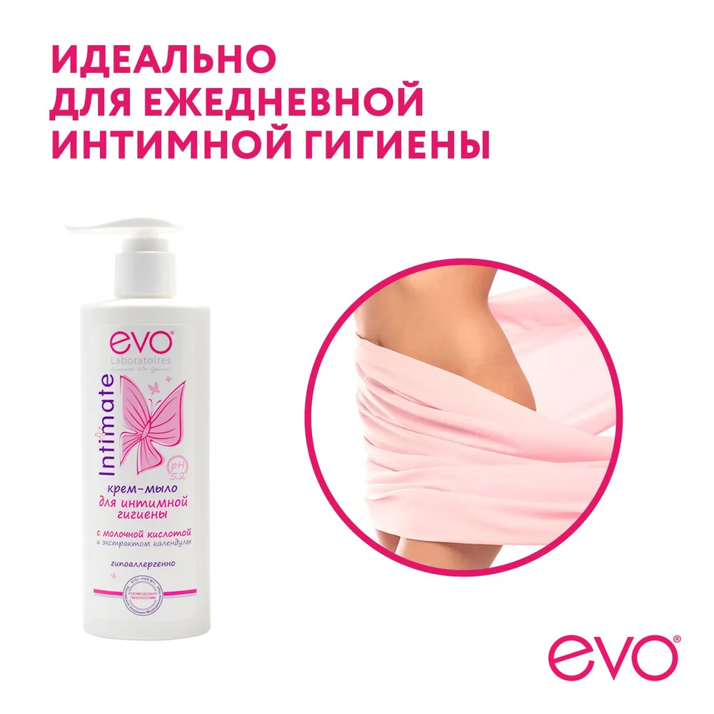 | Дополнительная информация | EVO Intimate Крем-мыло для интимной гигиены с молочной кислотой и экстрактом календулы. Гипоаллергенно. Особый уход для особой зоны. |