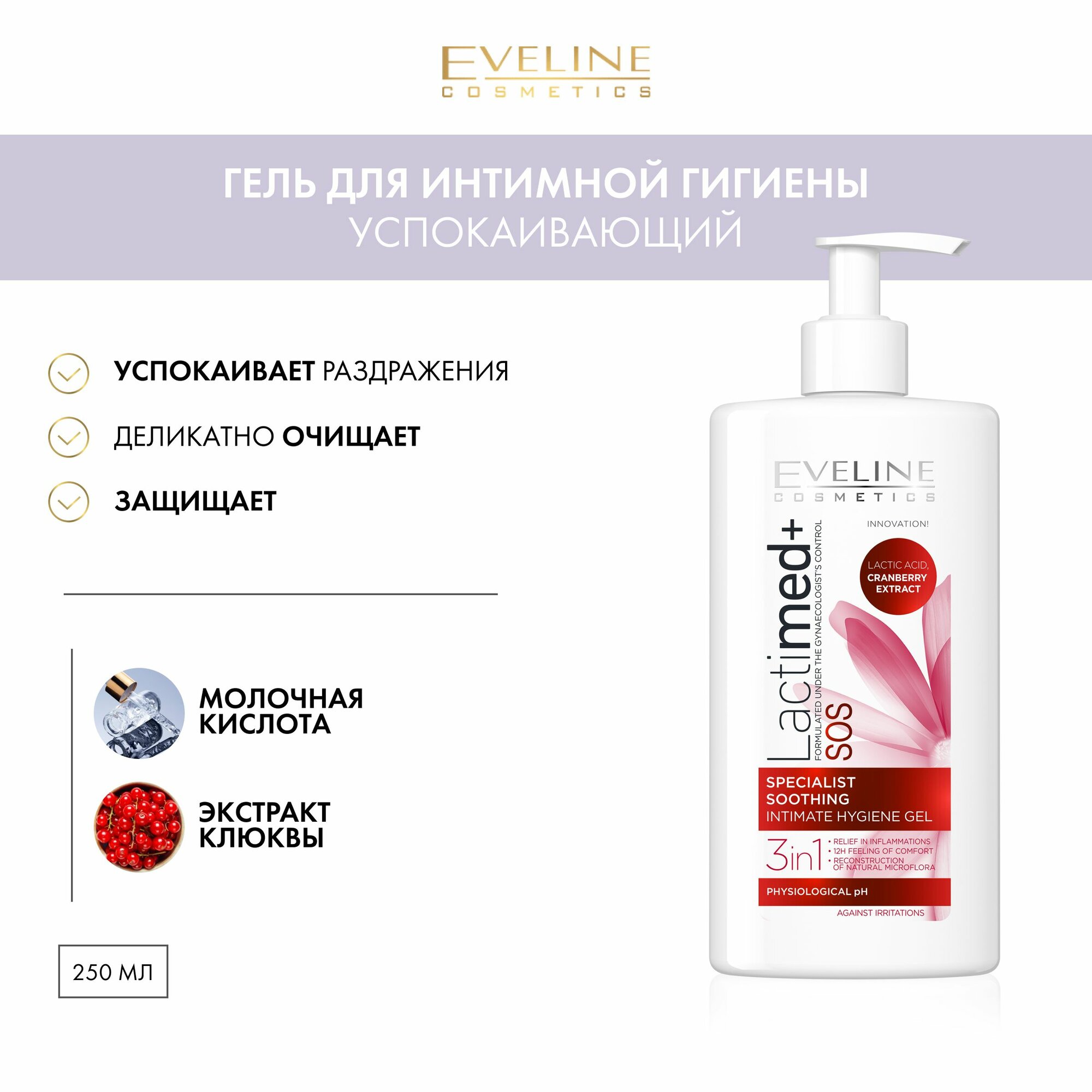 EVELINE Гель для интимной гигиены LACTIMED+ успокаивающий, молочная кислота + экстракт клюквы, 250 мл